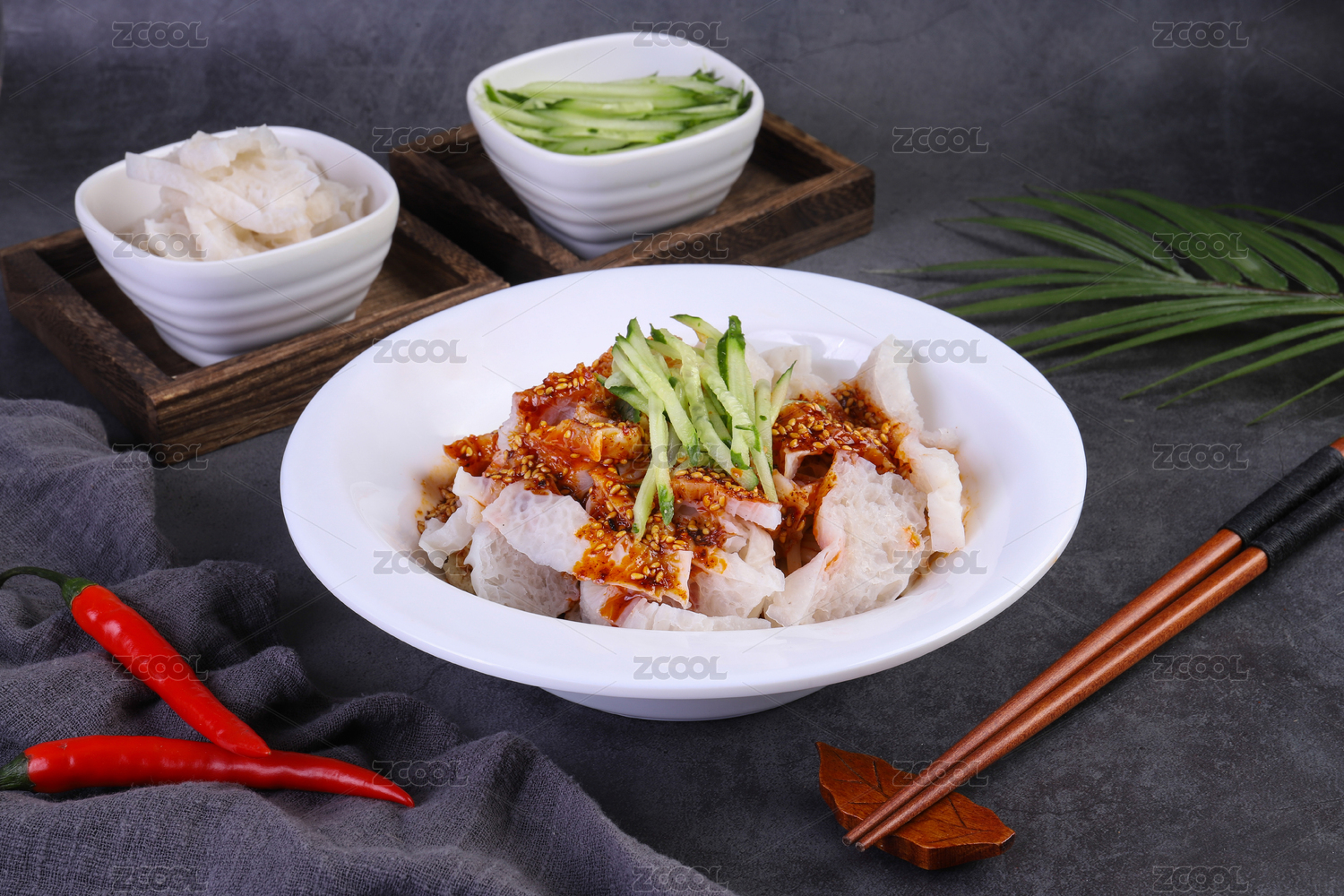 放在深色背景上盘子用筷子夹起来的凉皮呱呱