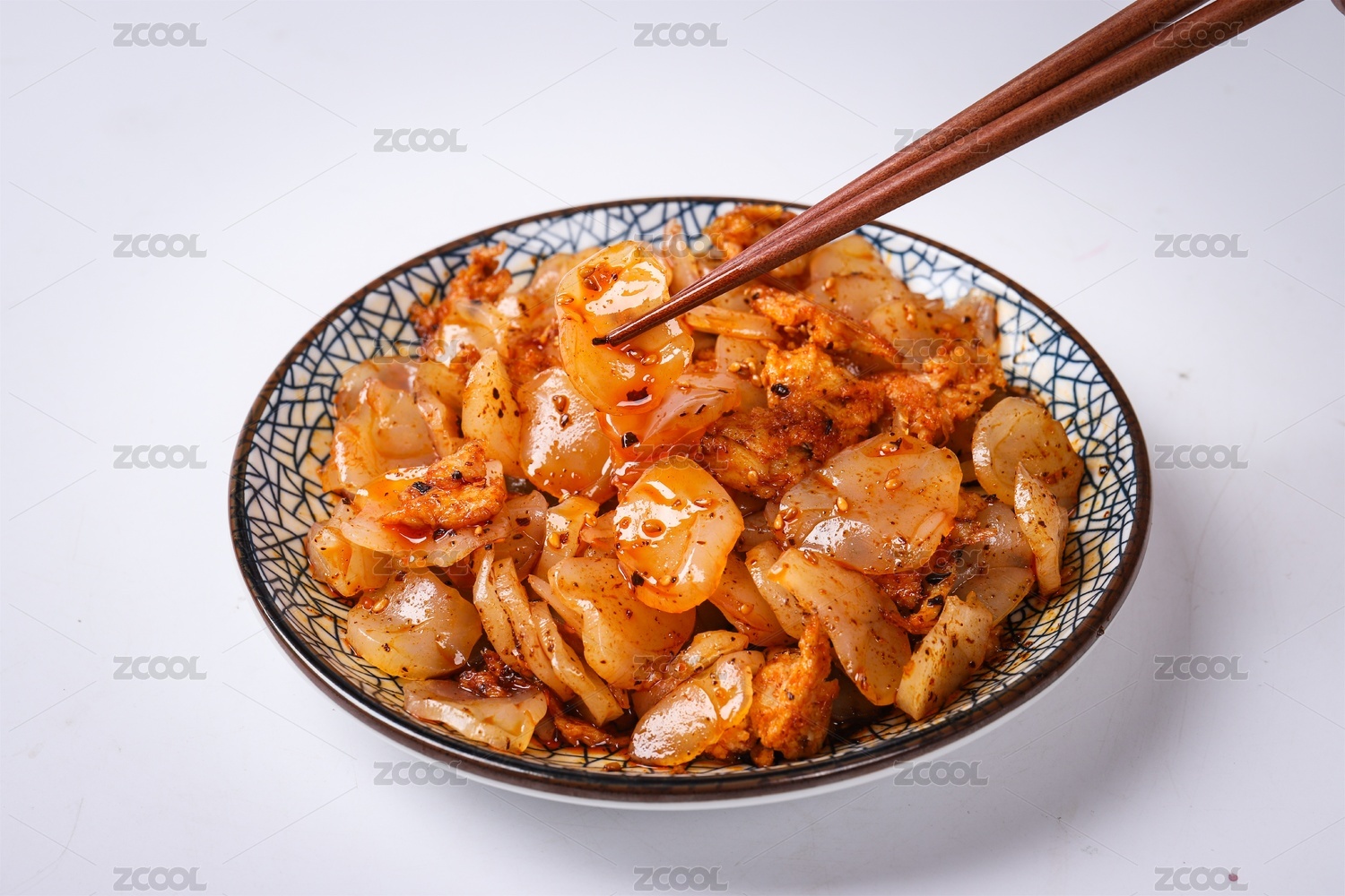 白色背景上盘子用筷子夹起来的凉皮呱呱