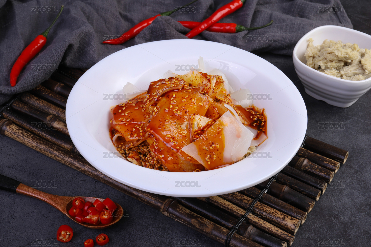放在麻布背景上盘子的香辣凉皮呱呱
