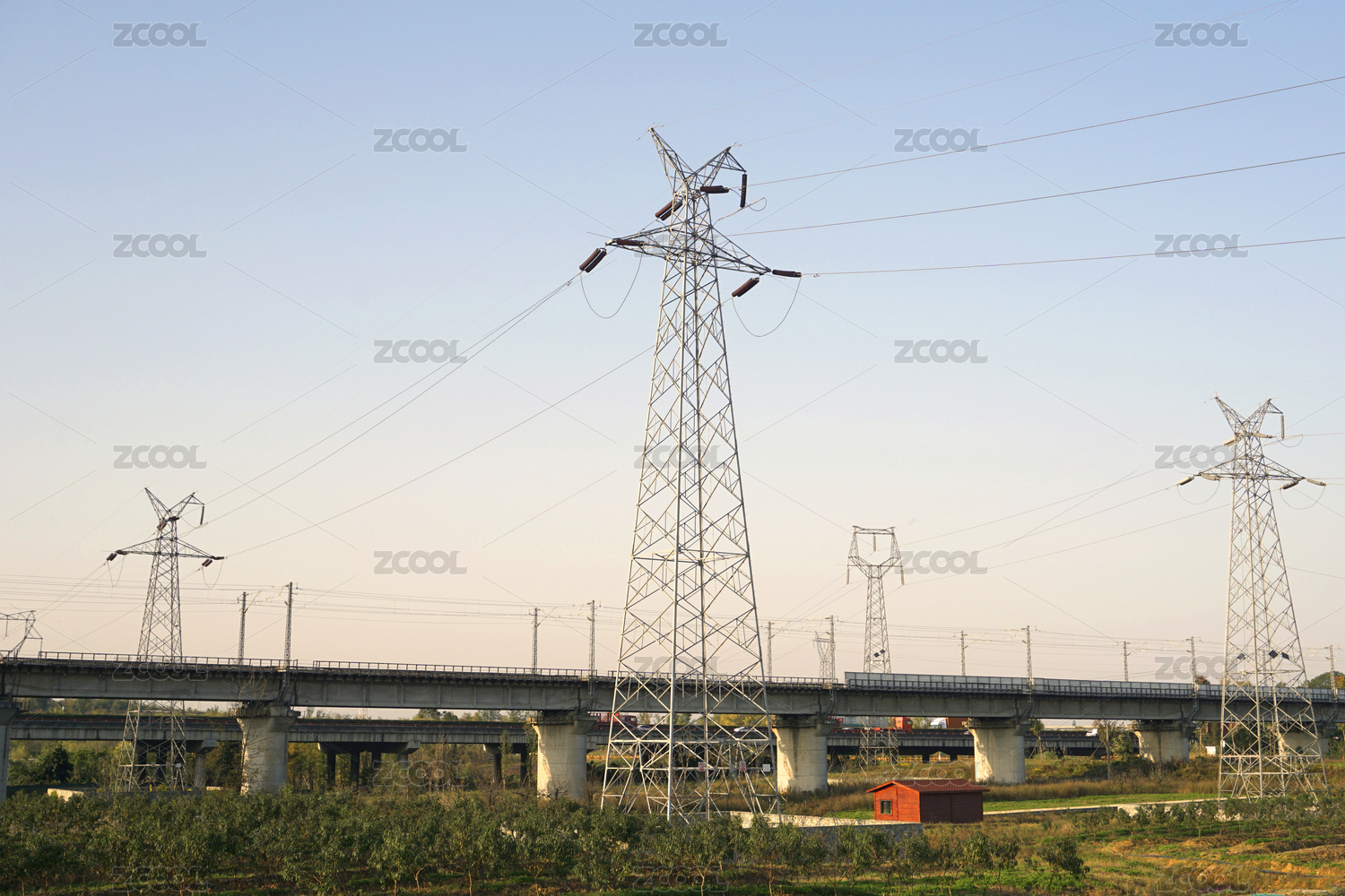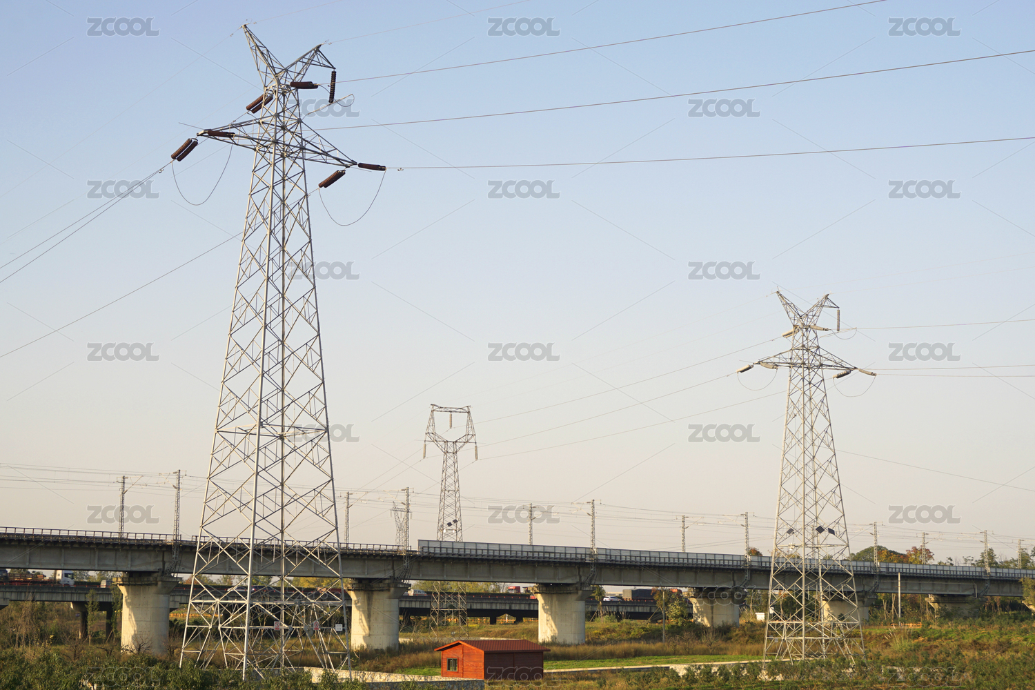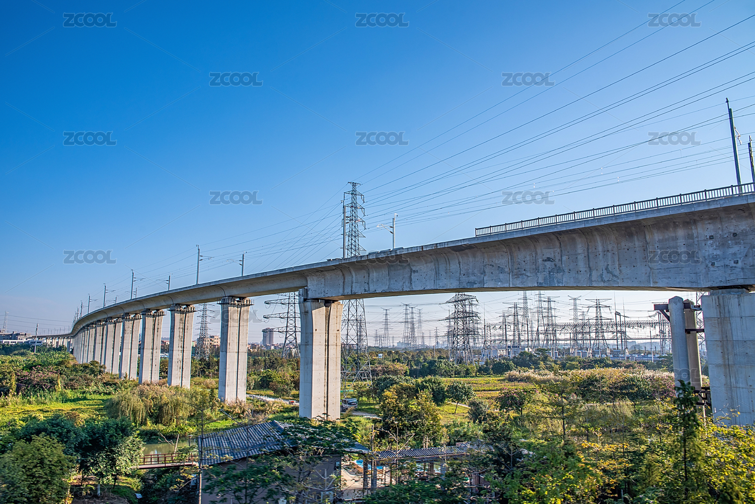 四川成都玉石湿地公园铁路高架桥和电线塔