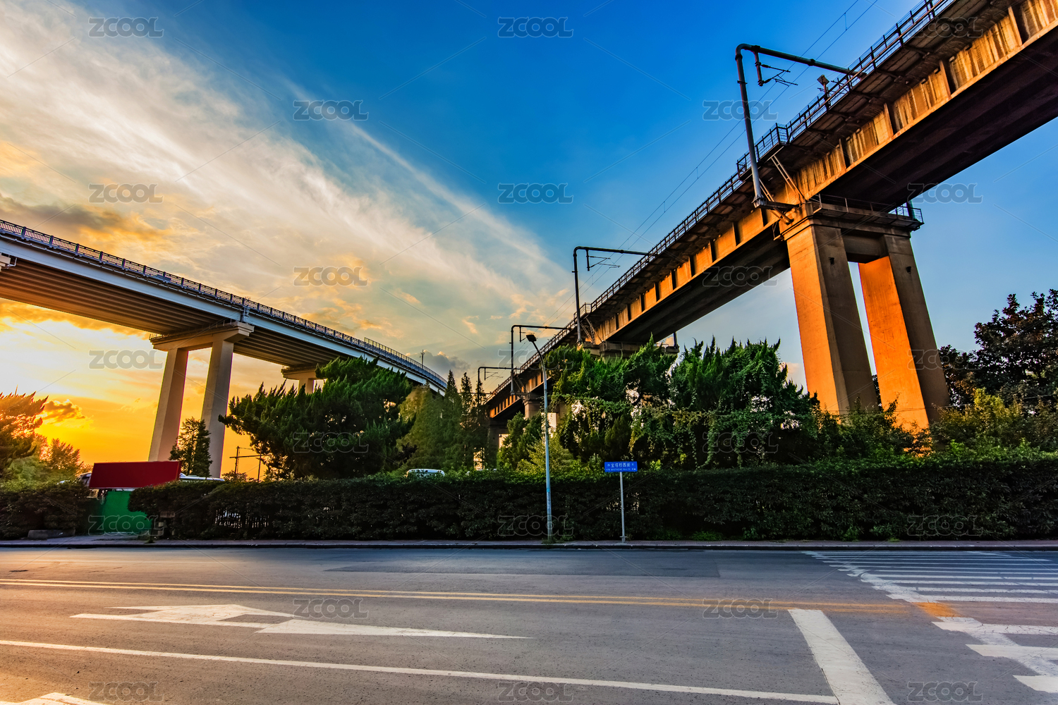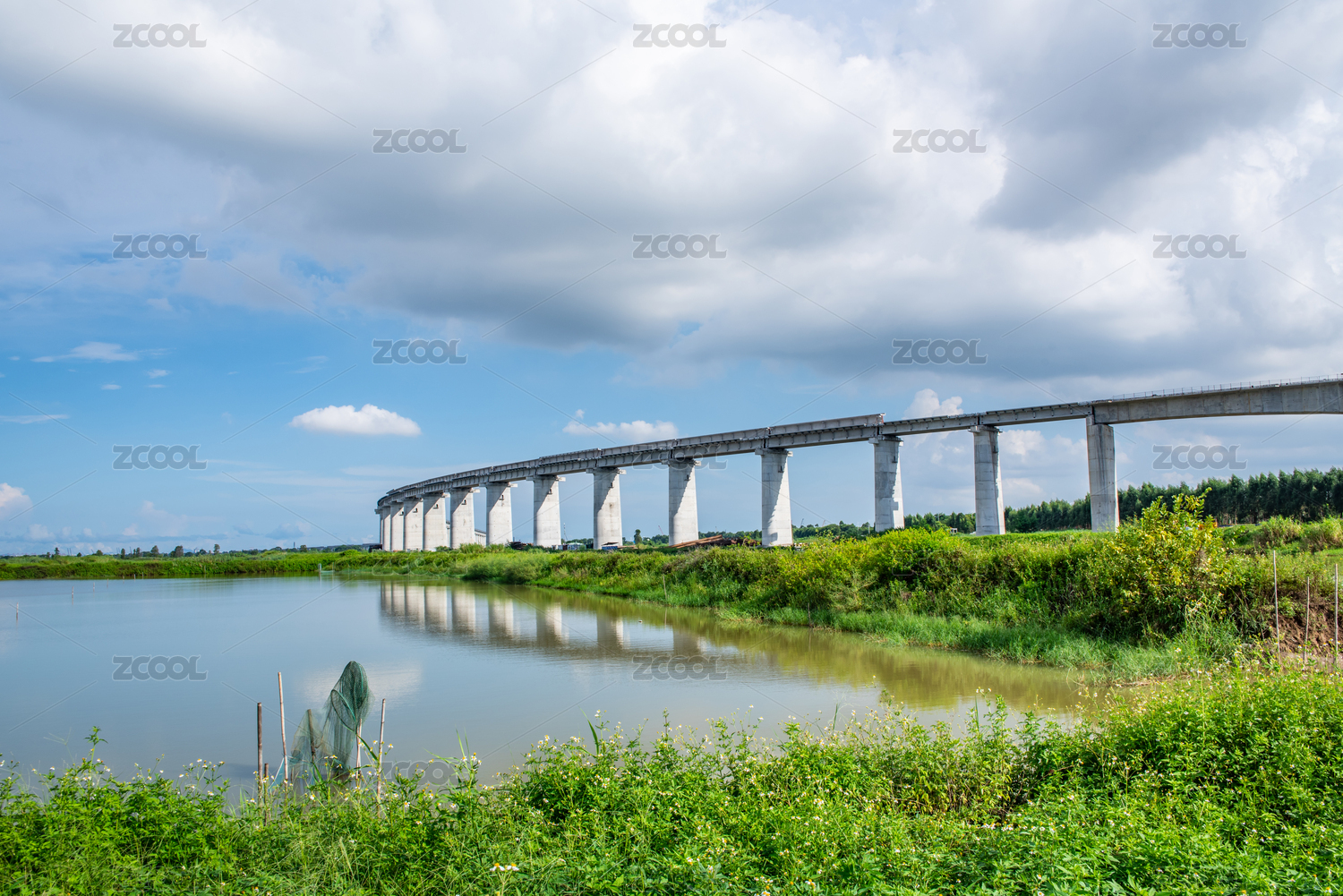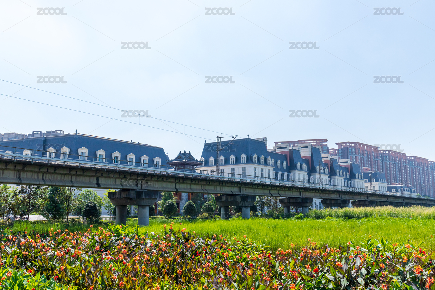 四川成都玉石湿地公园铁路高架桥和电线塔
