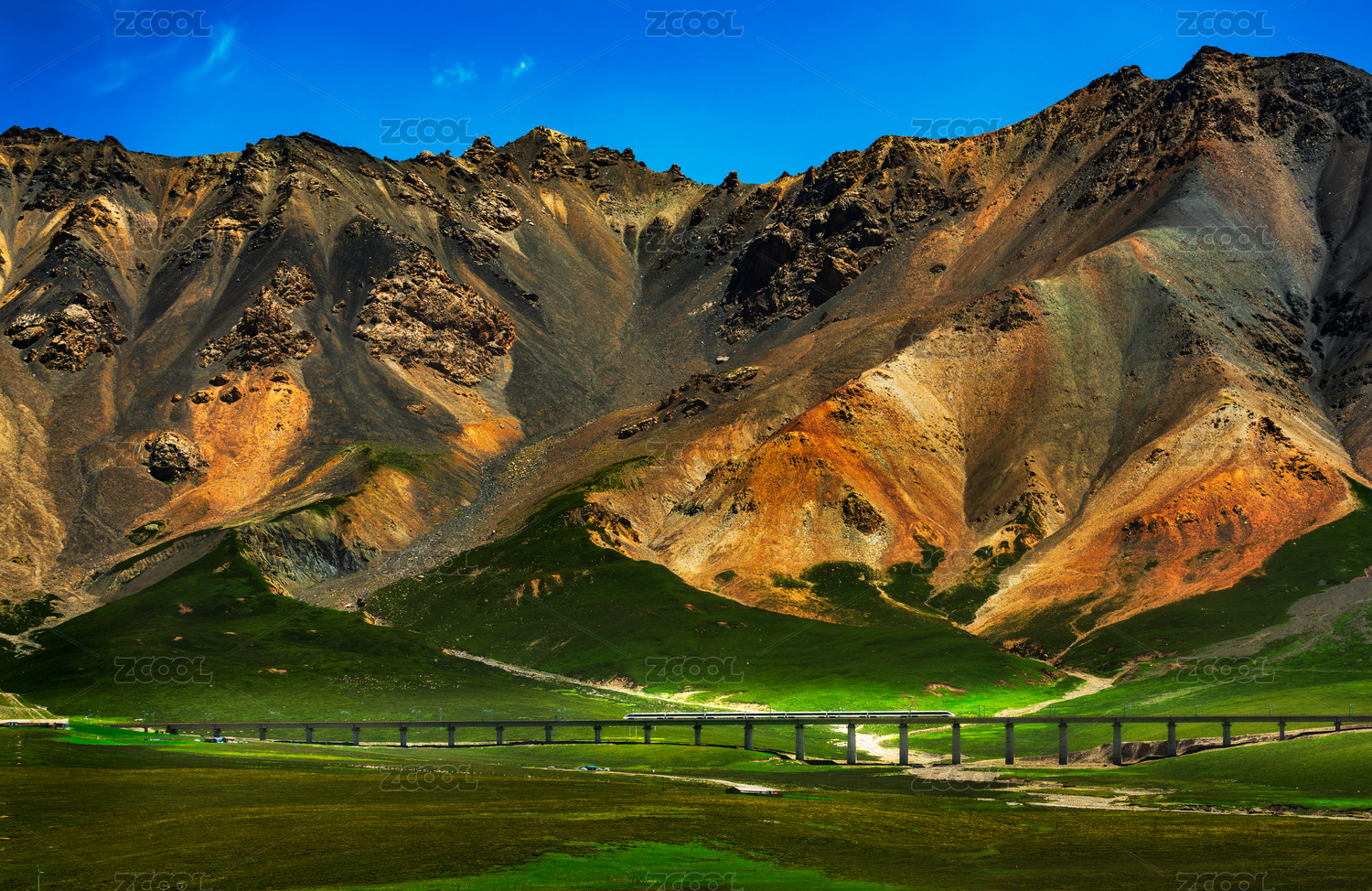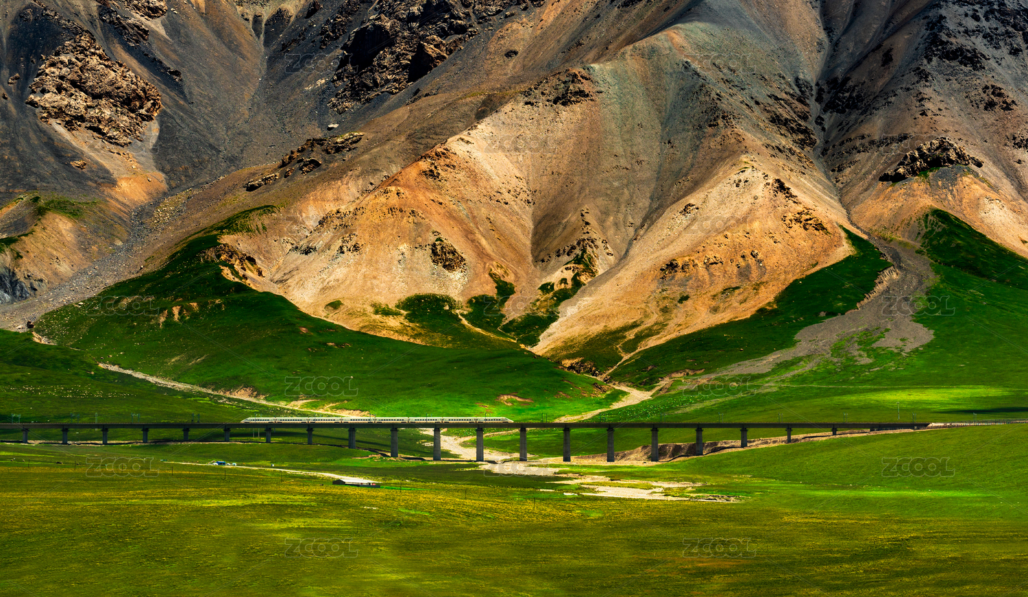 祁连山下兰新高速铁路高架桥上行驶的铁路高
