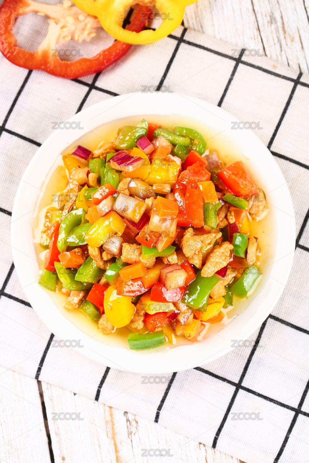 格子布上放着一盘五彩椒炒肉