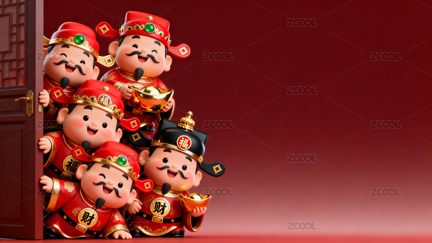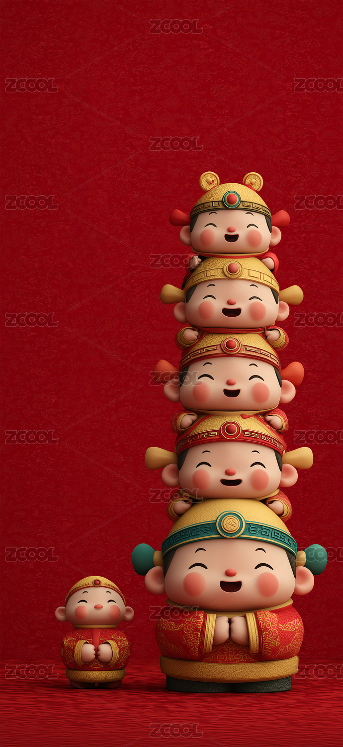 3D卡通呆萌Q版财神堆叠探头五路财神