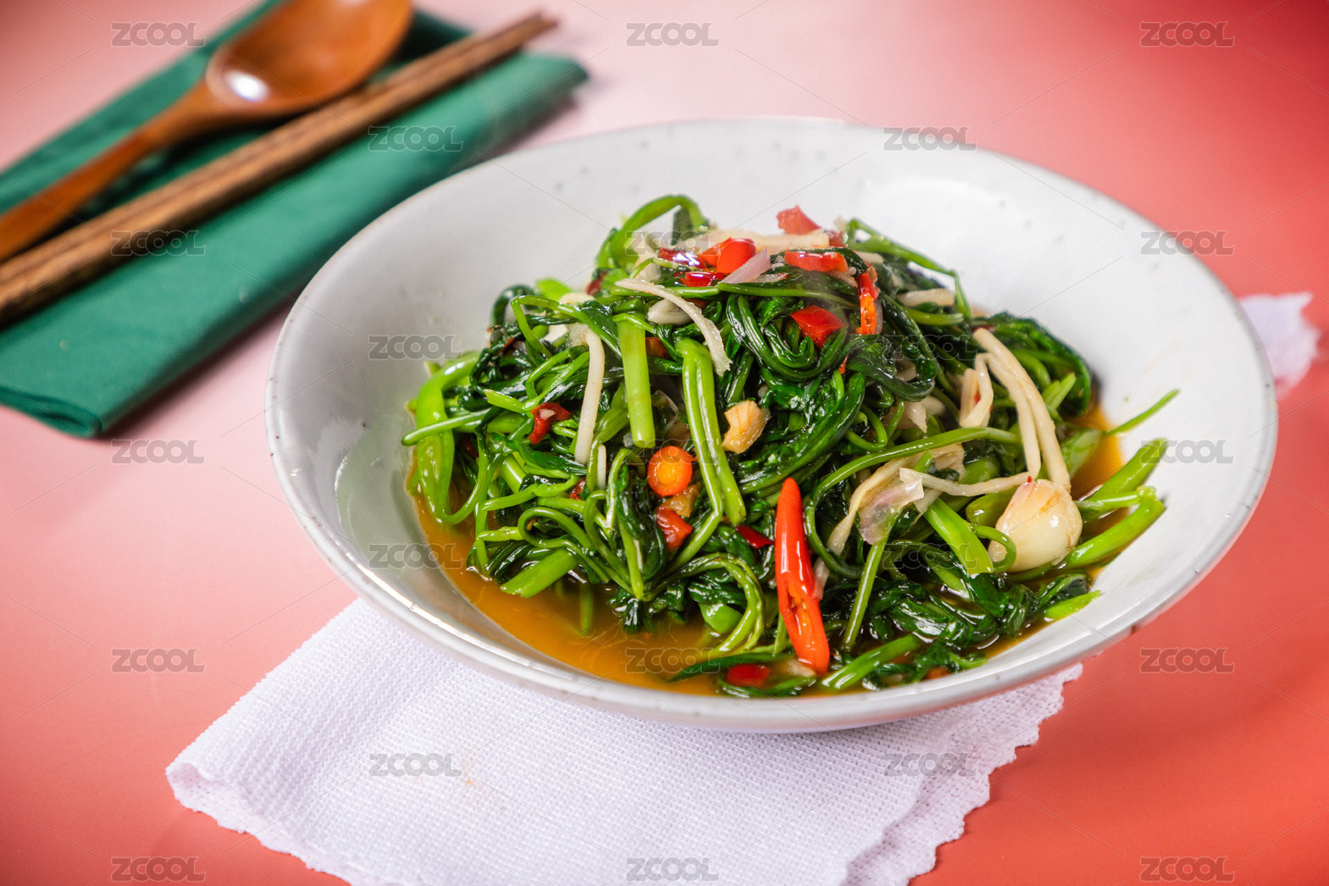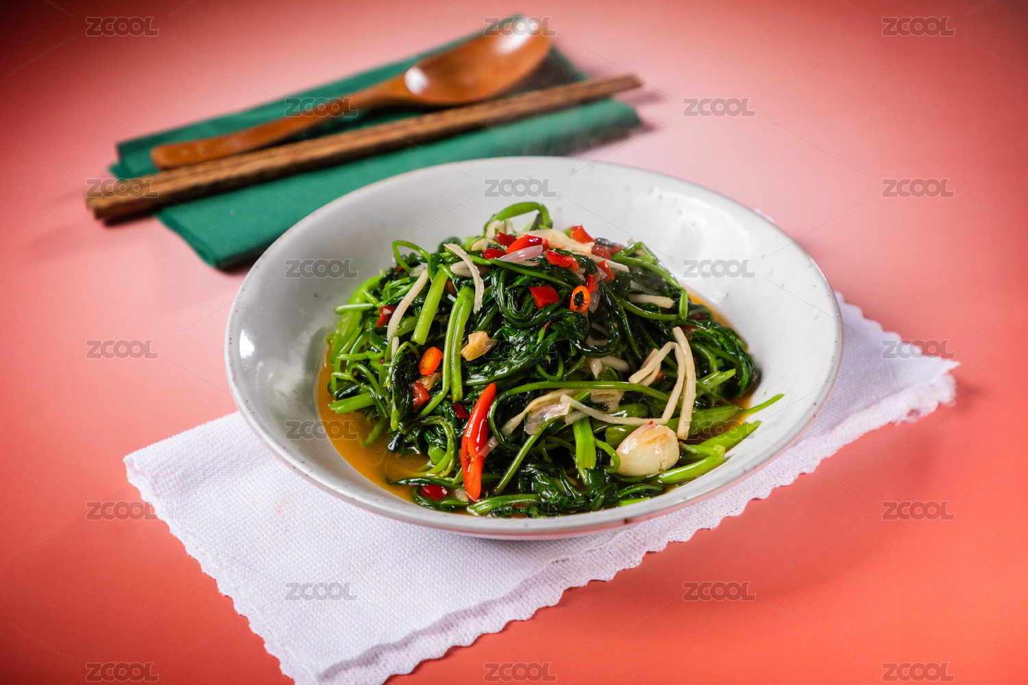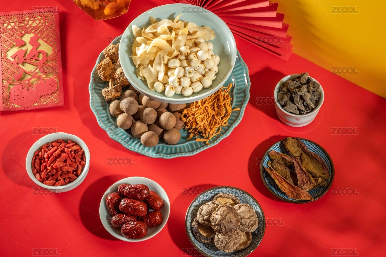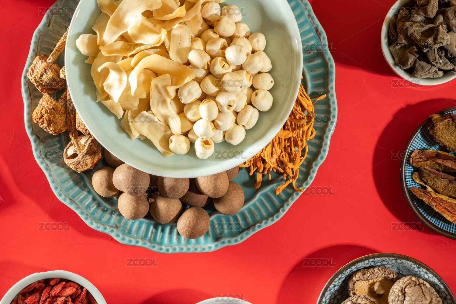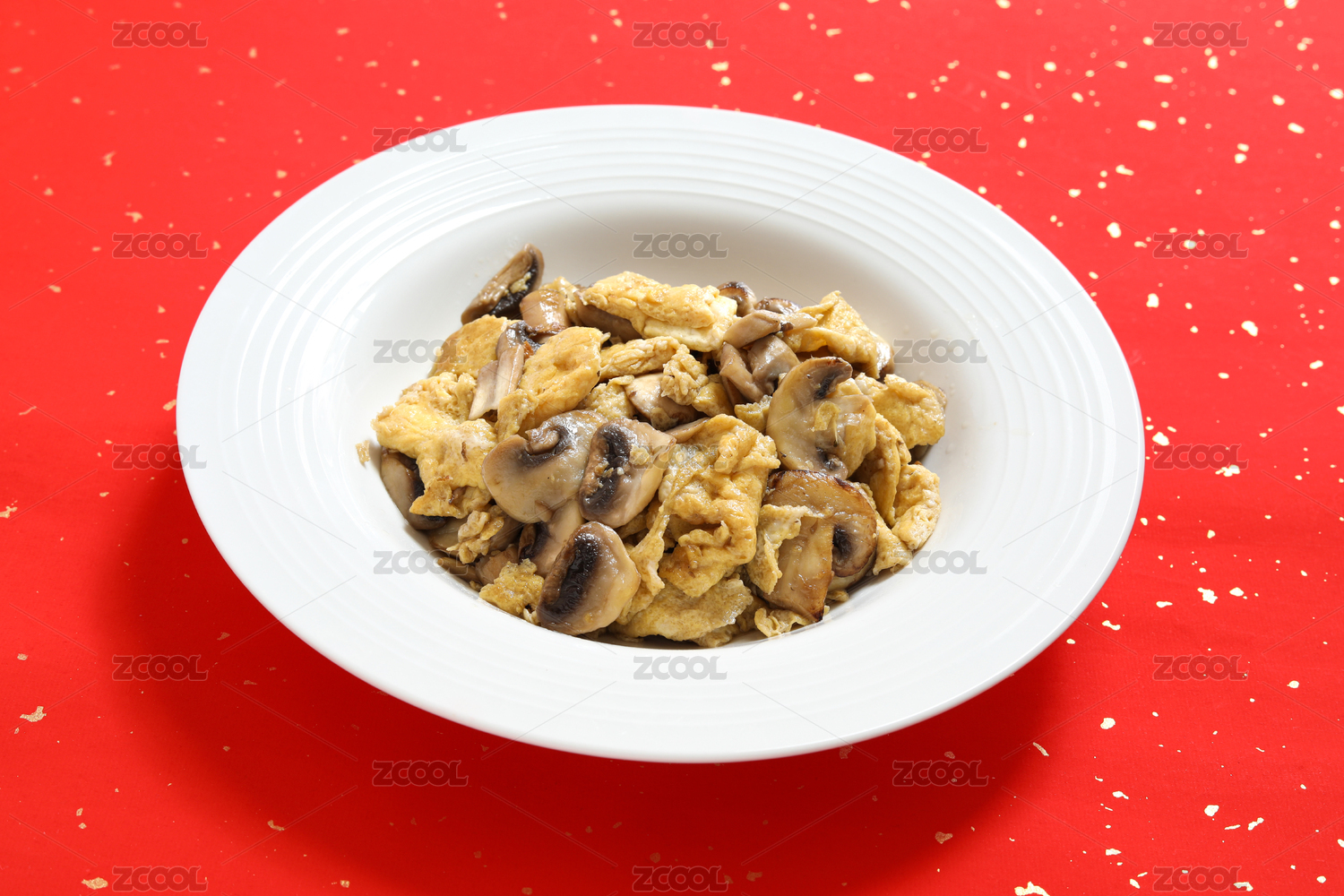 红色桌面上的一盘中餐美食家常菜香菇炒鸡蛋