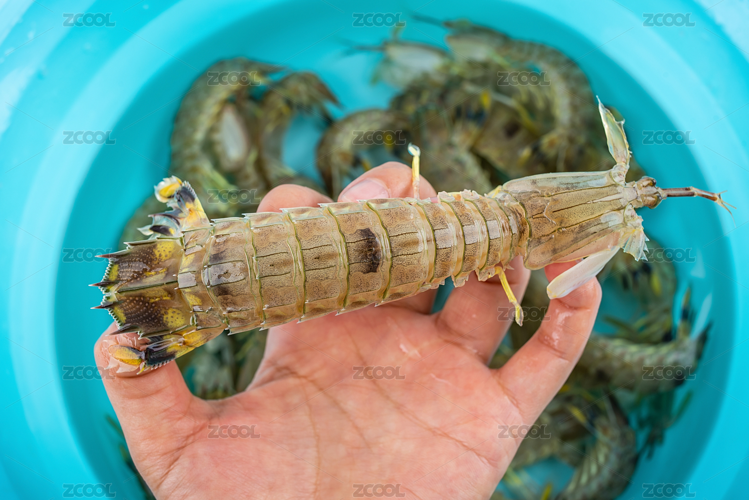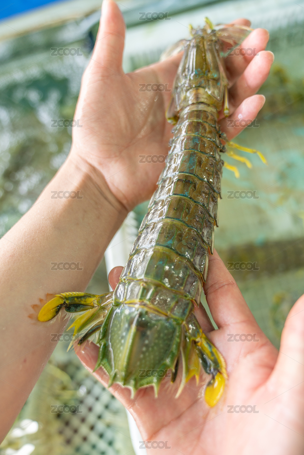 手拿一只活海鲜食材大虾蛄背景带海鲜池