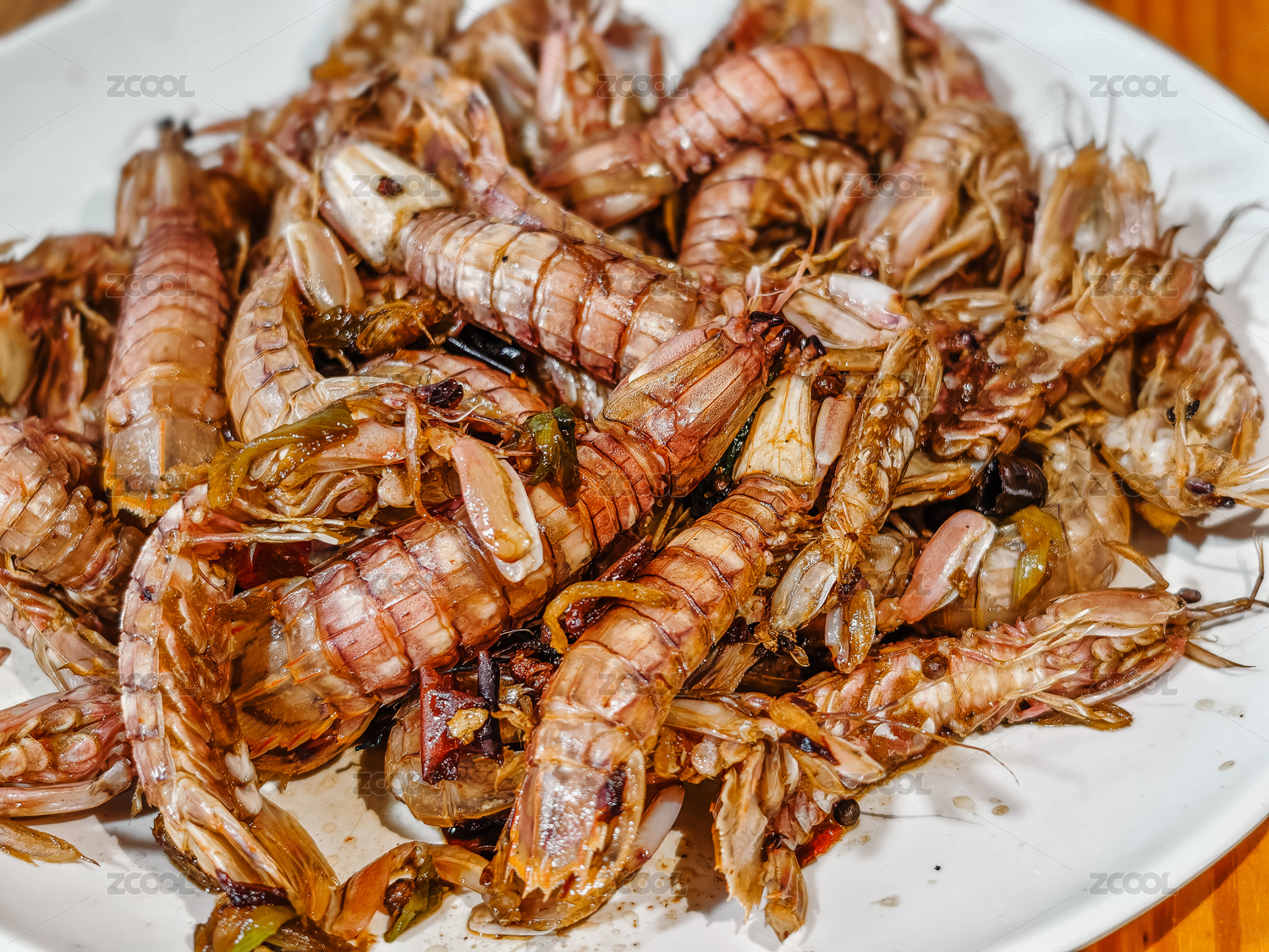 酒店传统菜香酥皮皮虾整齐码放在白色瓷盘中