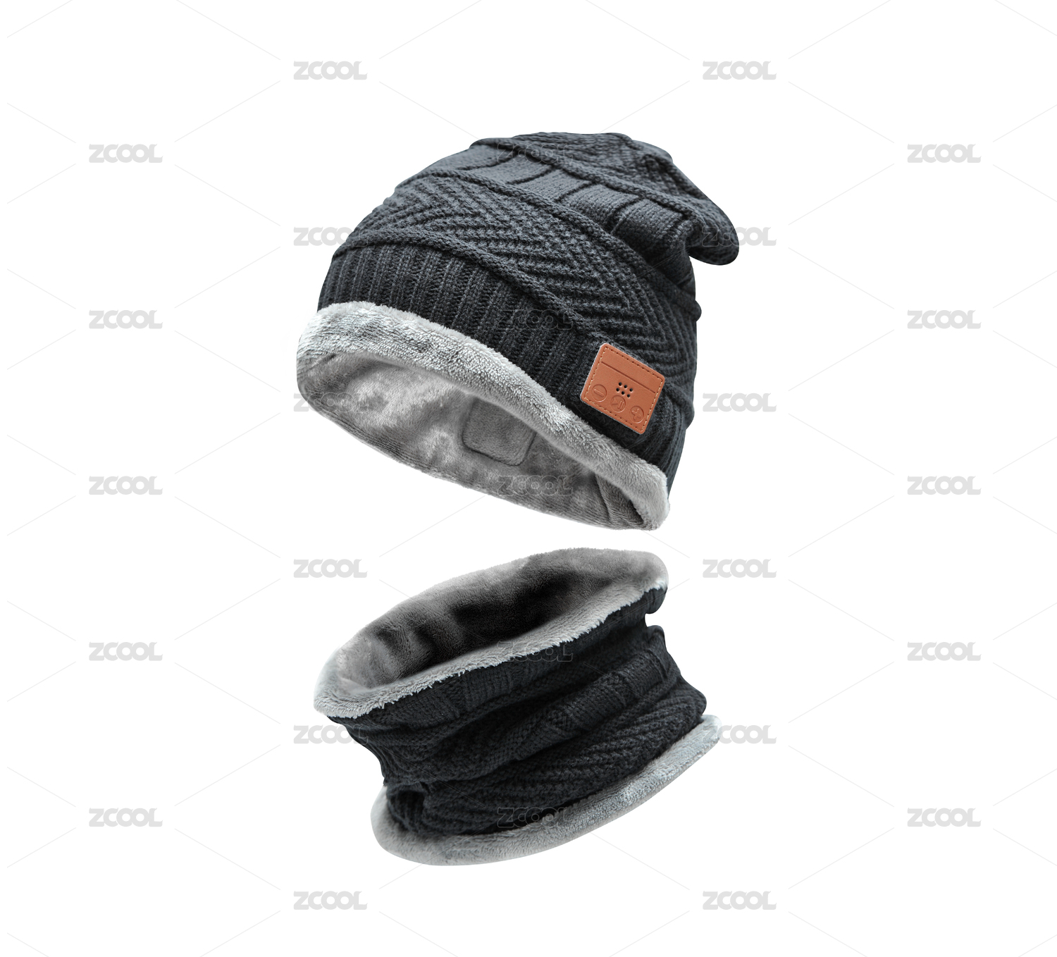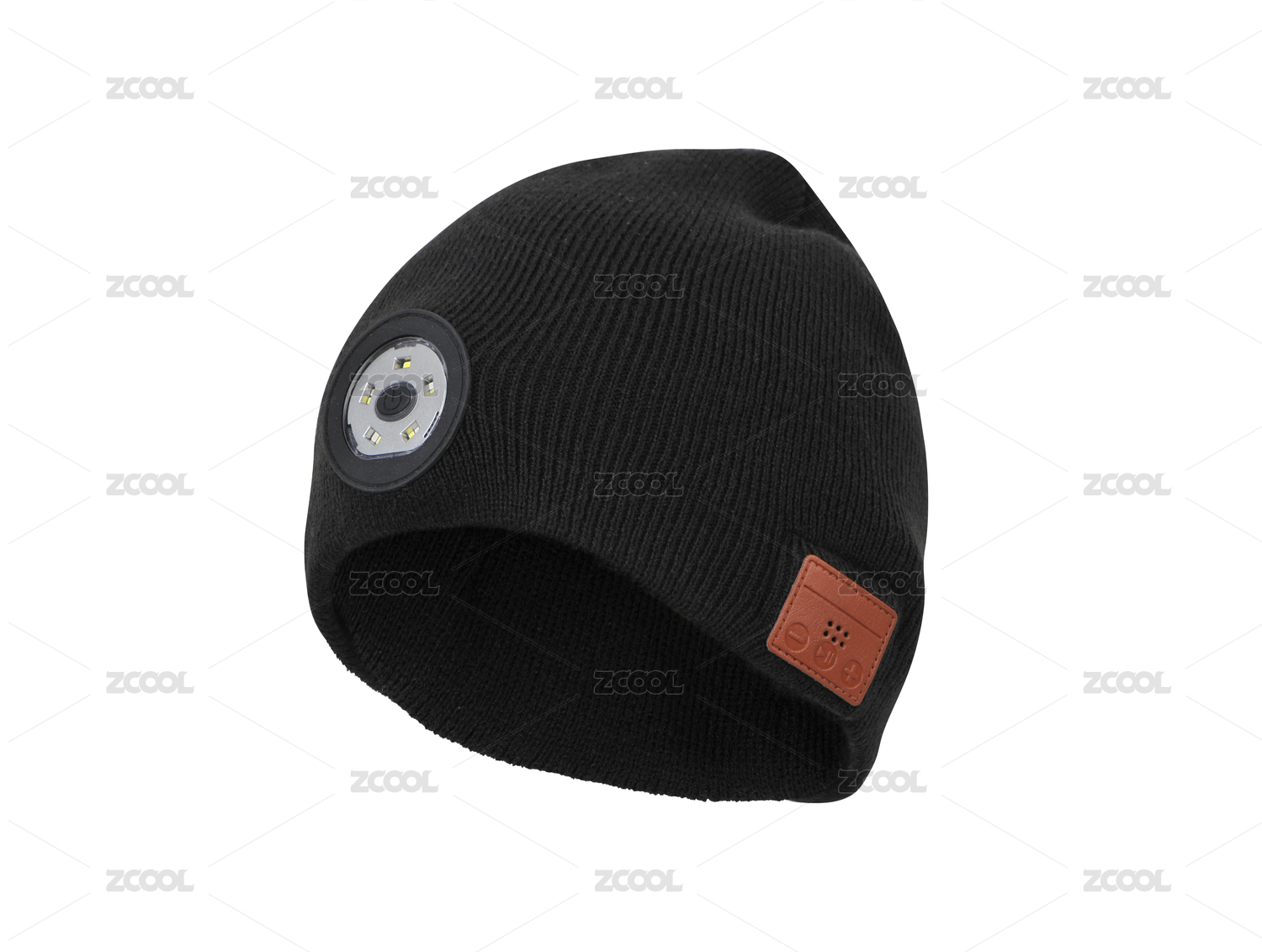 带LED灯具和耳机的黑色针织防寒毛线帽