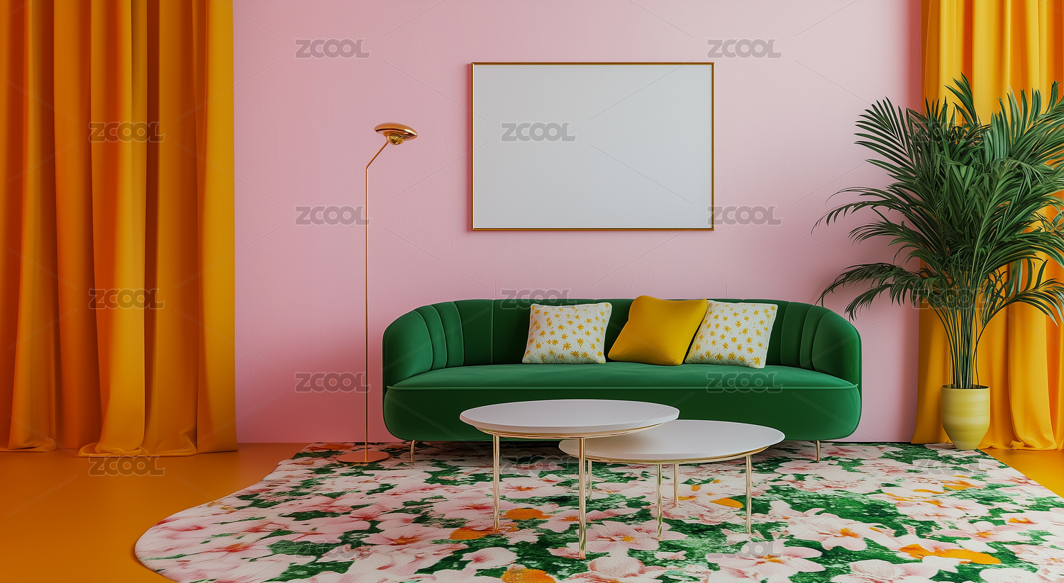 白色沙发金框画框植物