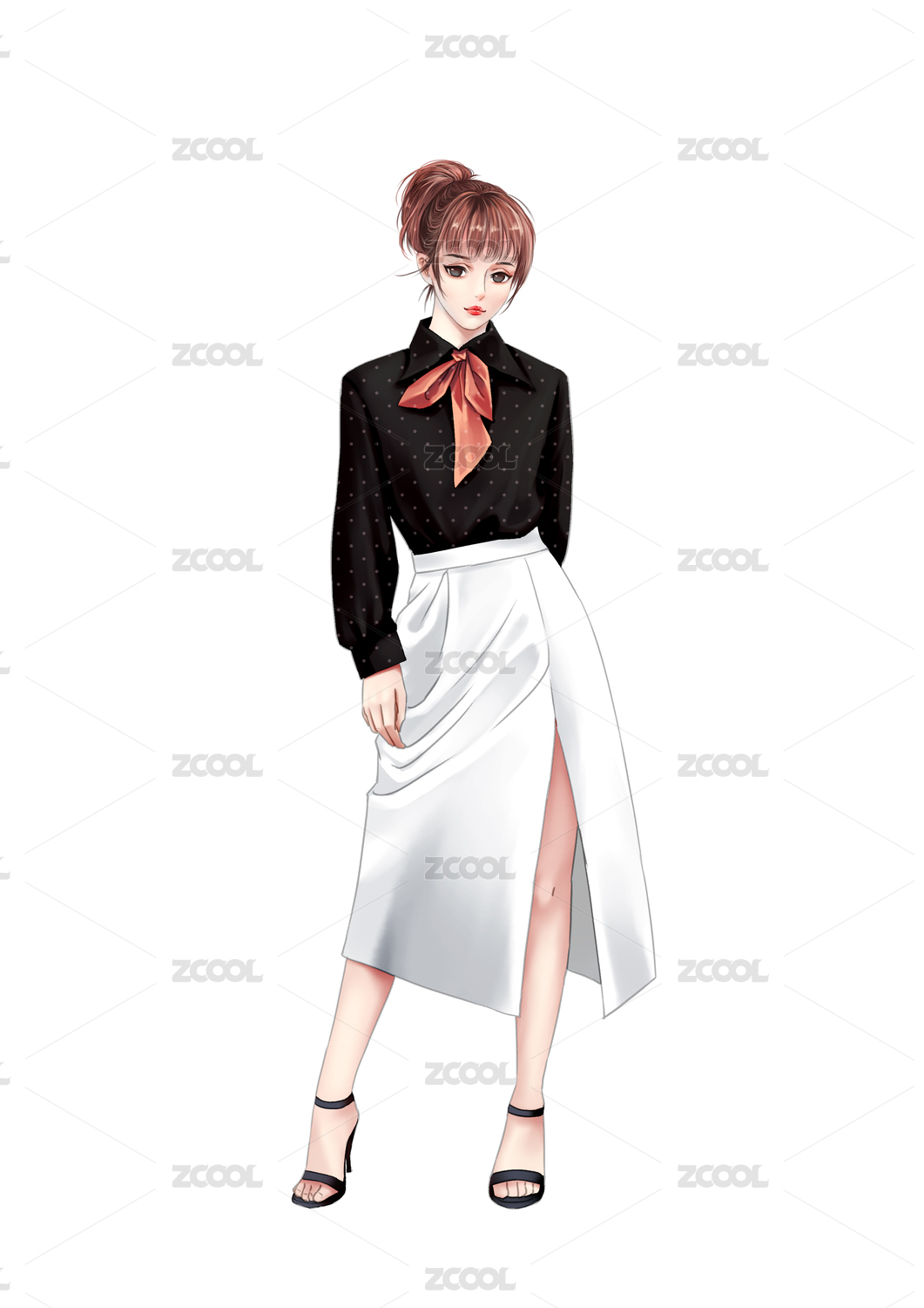 穿黑色衬衫白色裙子的时尚职业女性无背景
