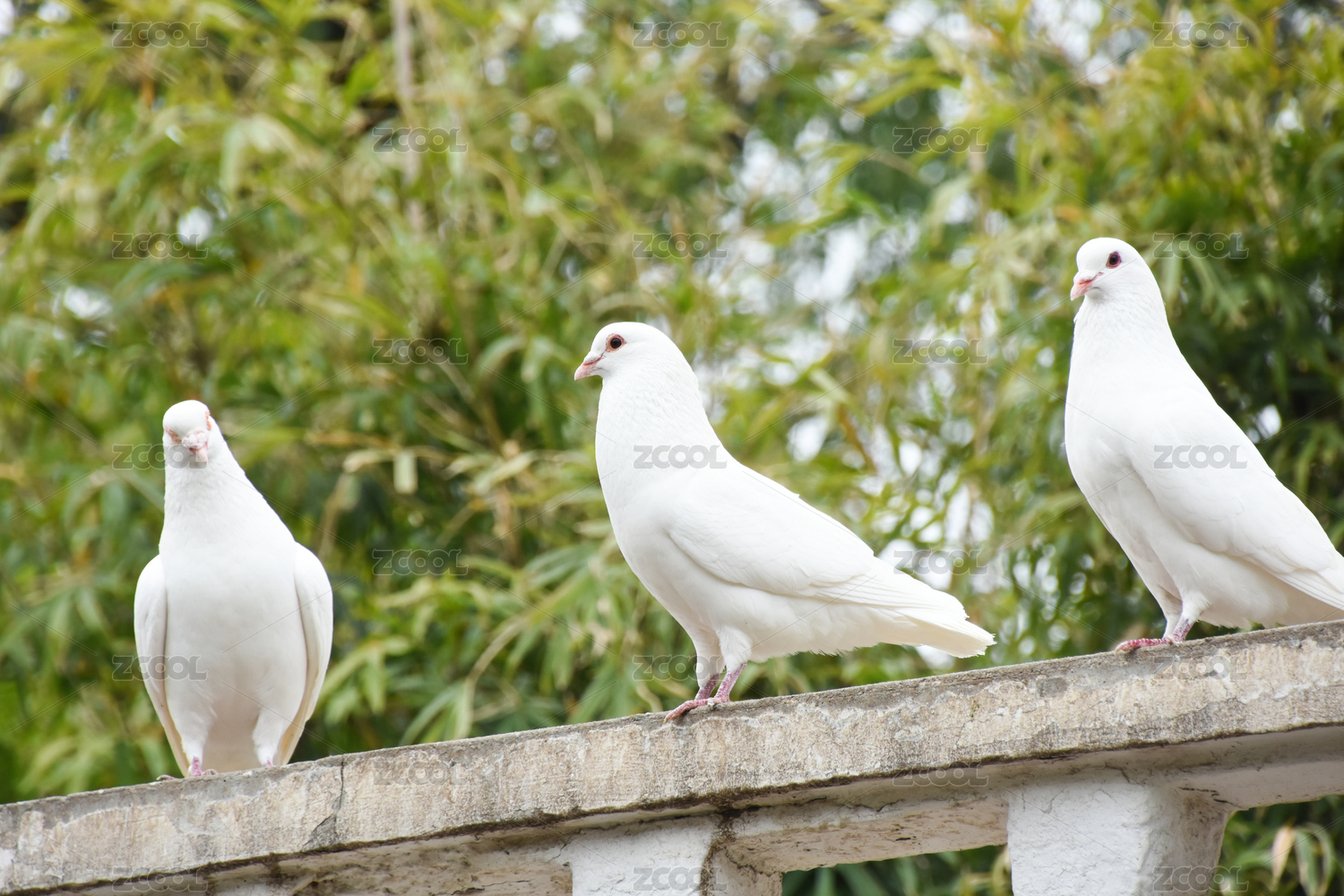 栏杆上纯白的三只鸽子特写