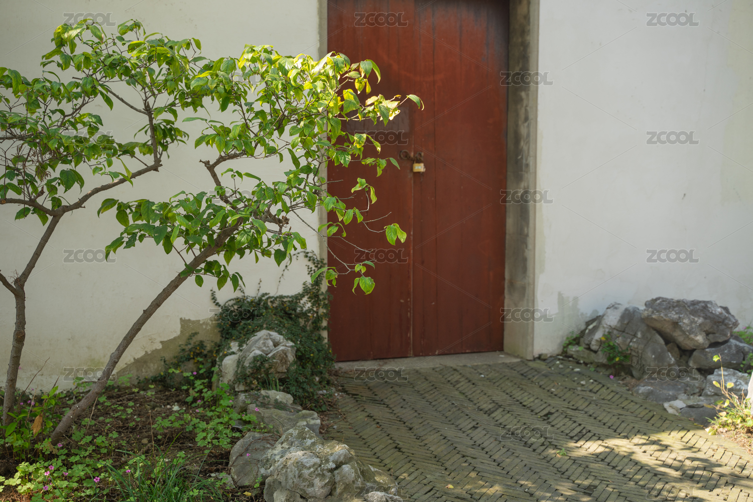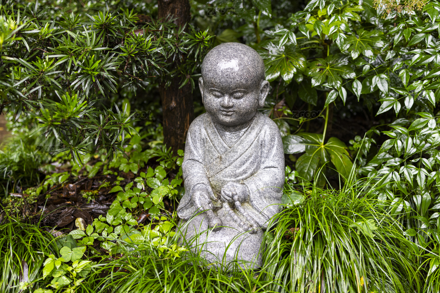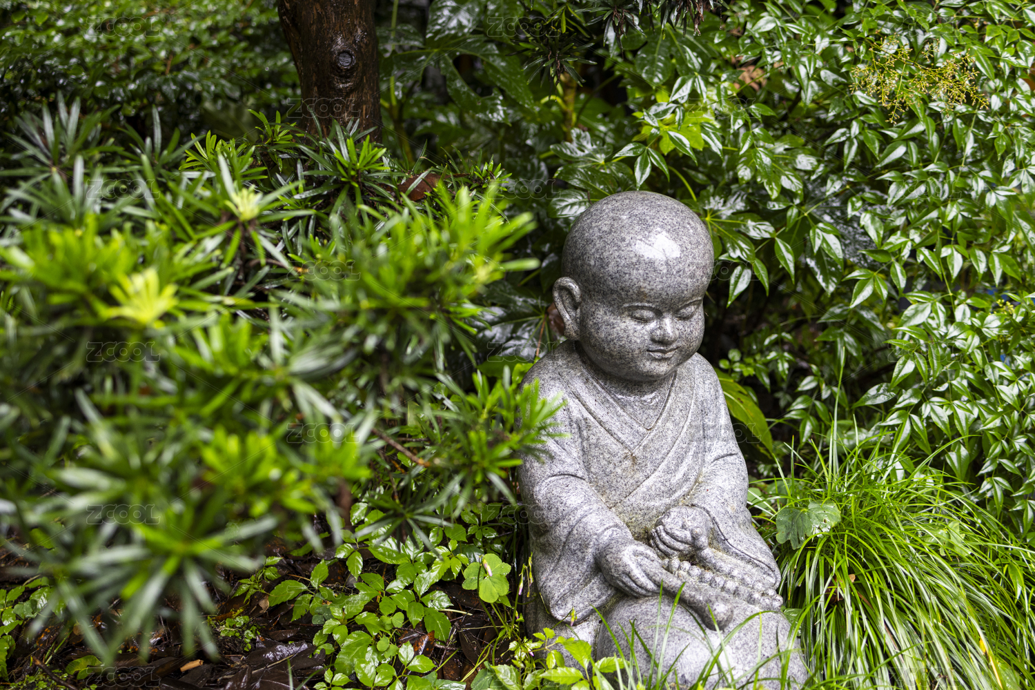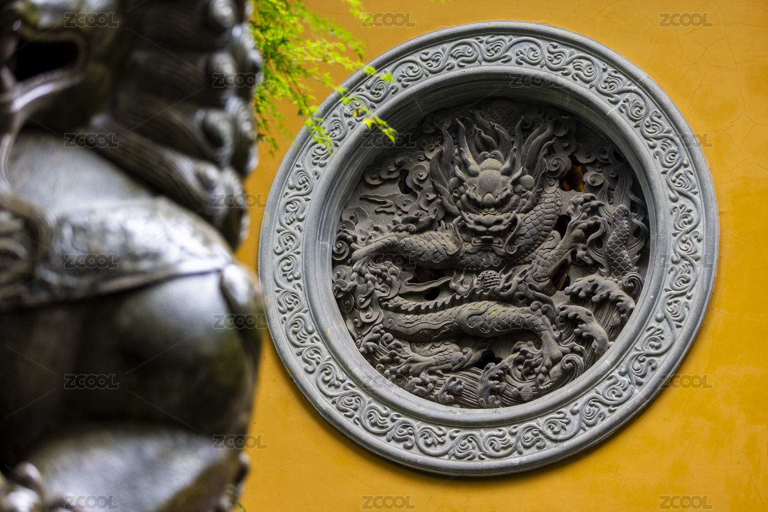 中国杭州永福寺静谧的下雨天石狮石雕龙