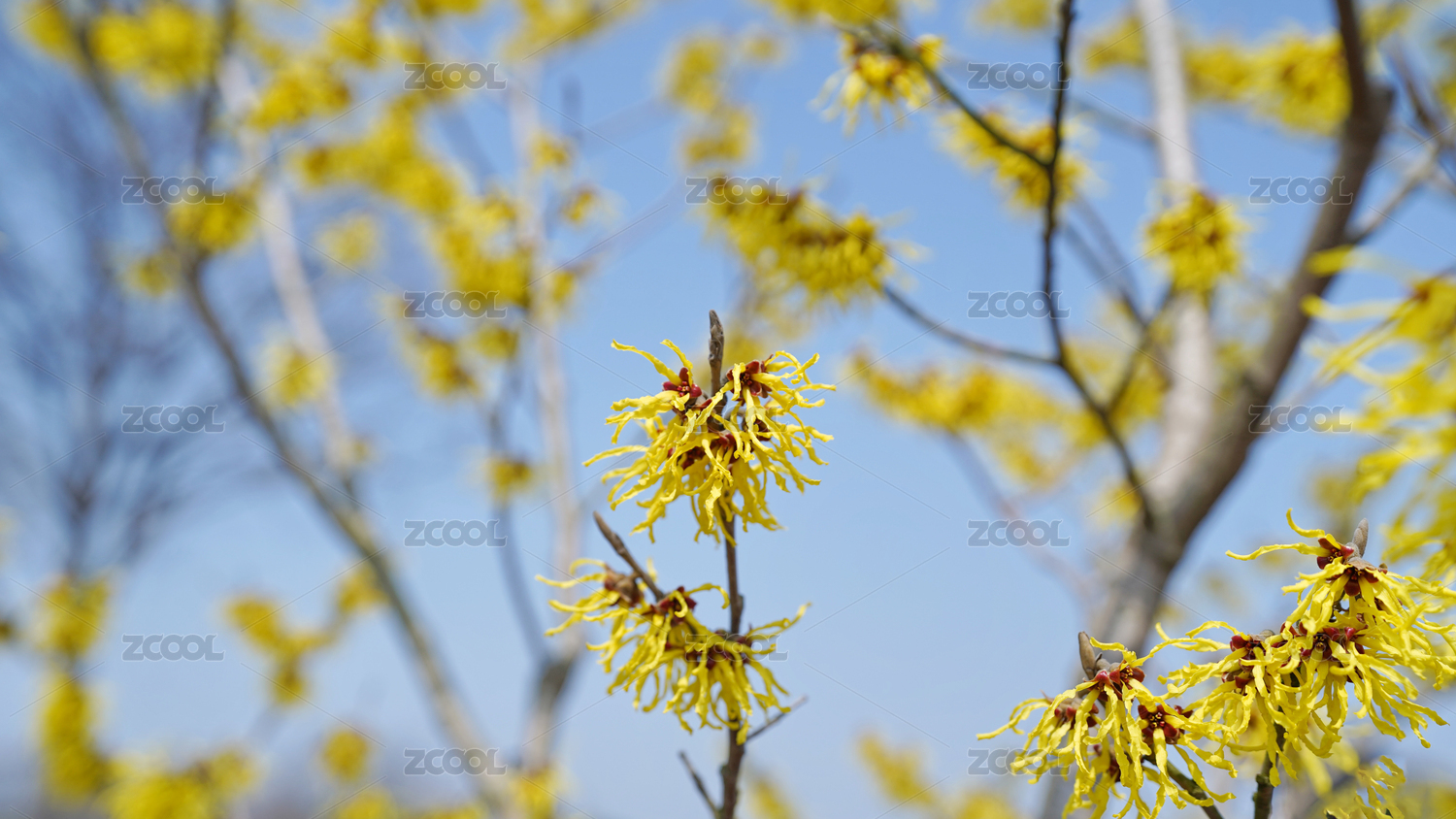 蓝天下金缕梅流苏状的花和枝条横构图