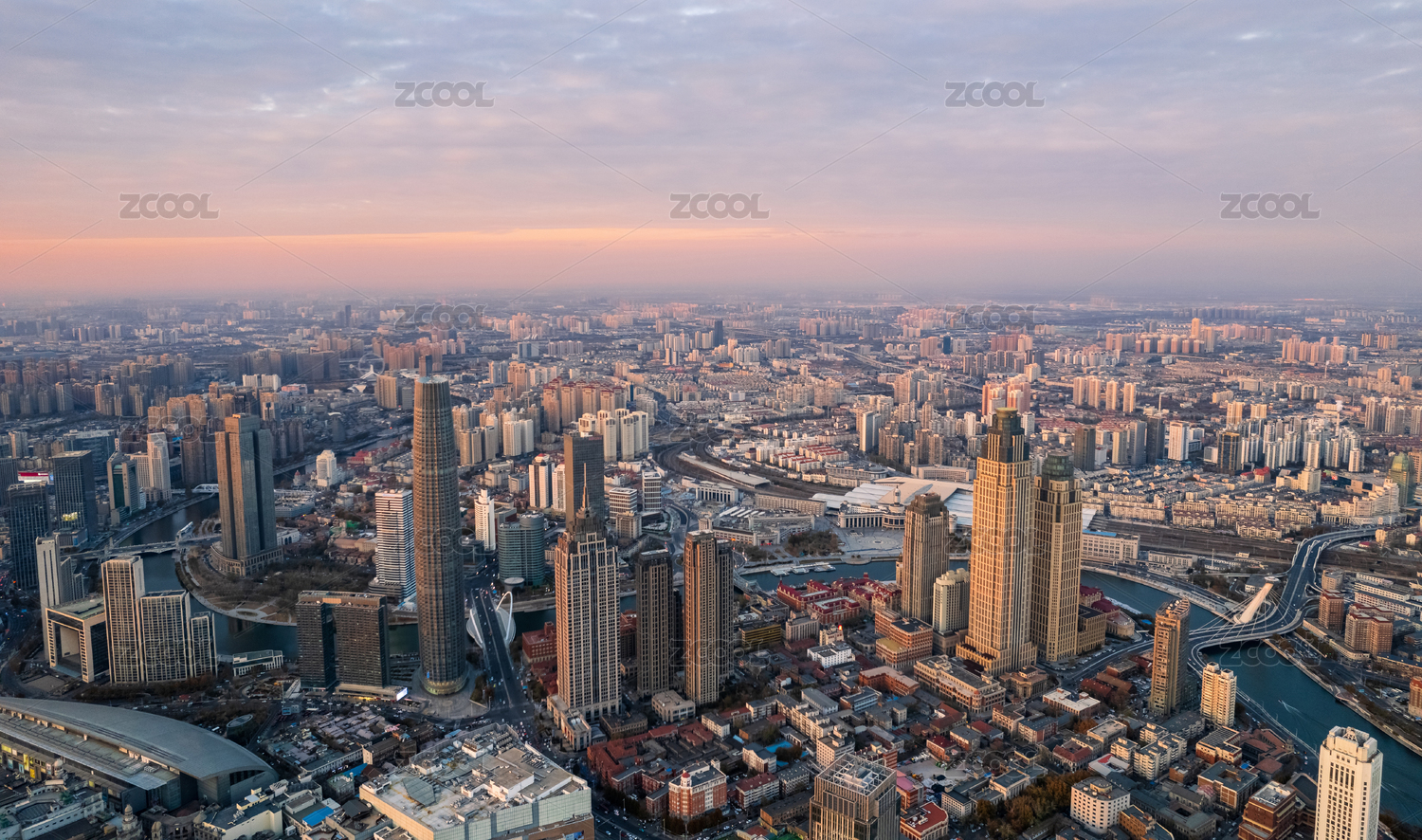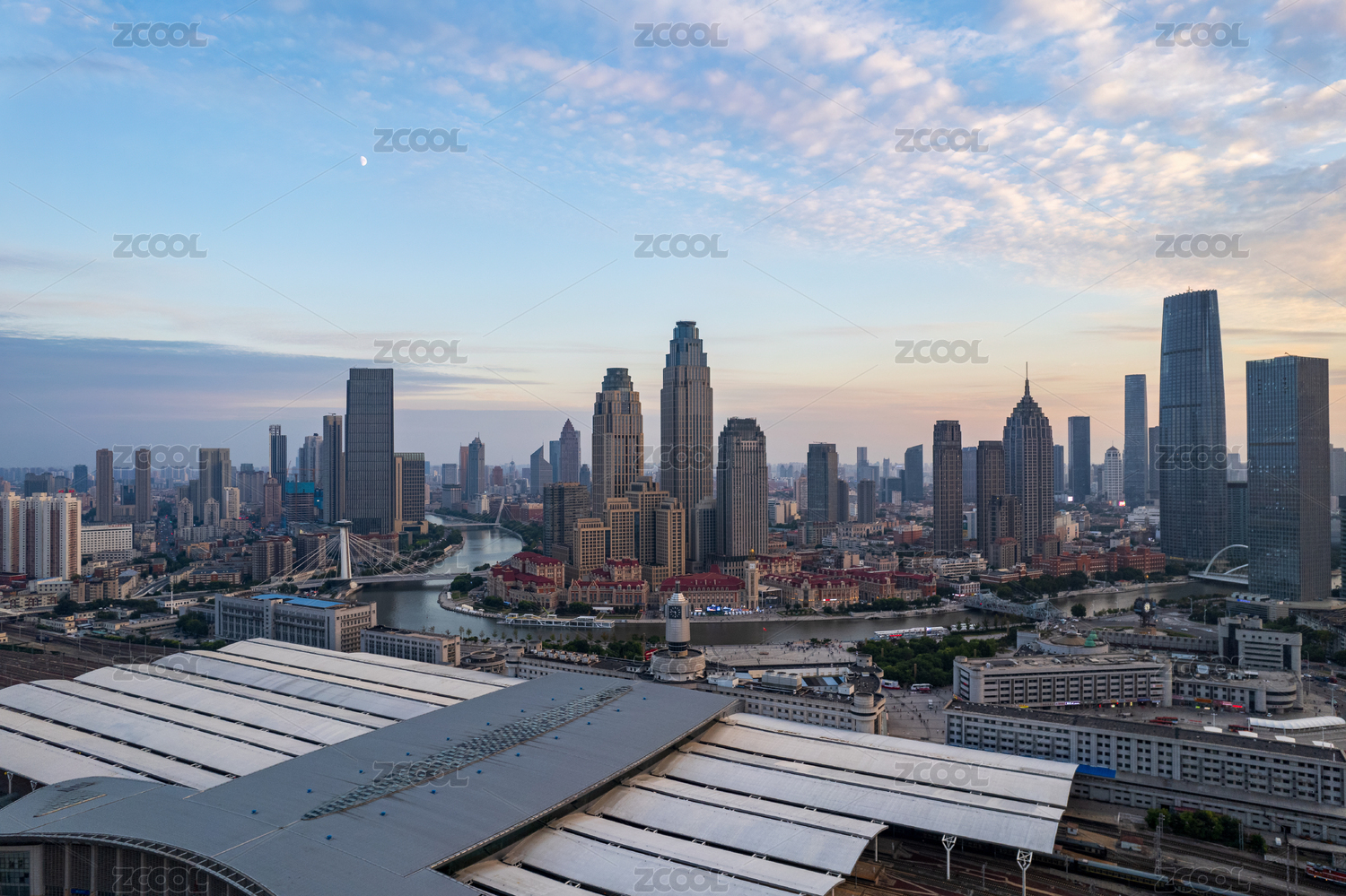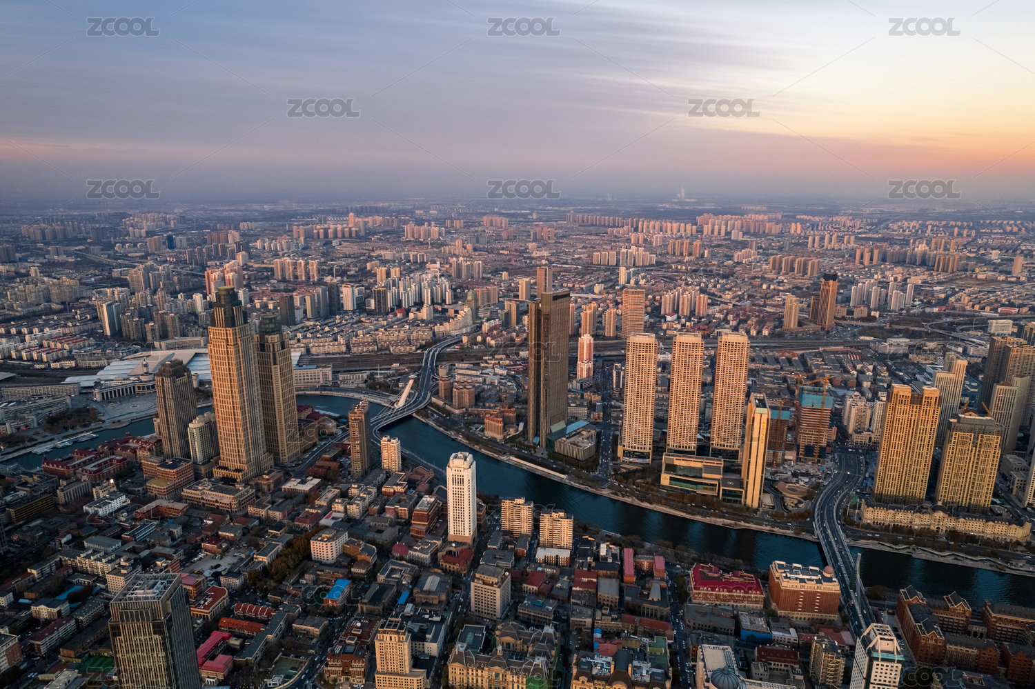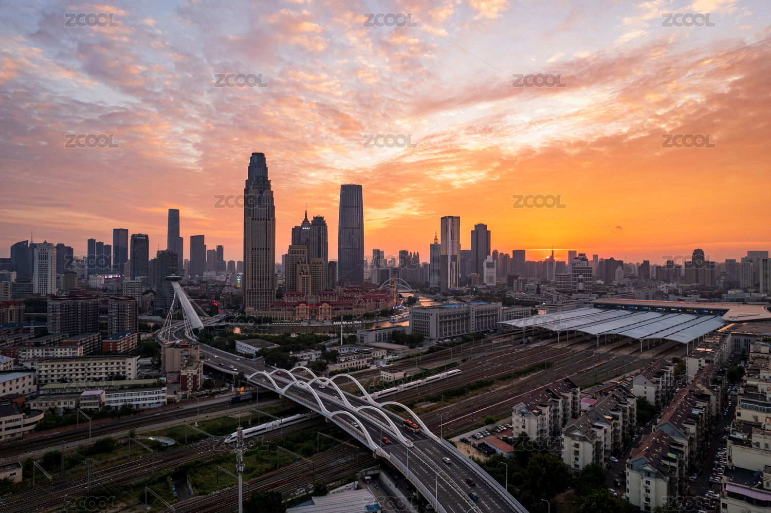 天津站海河津湾广场城市建筑日落晚霞航拍