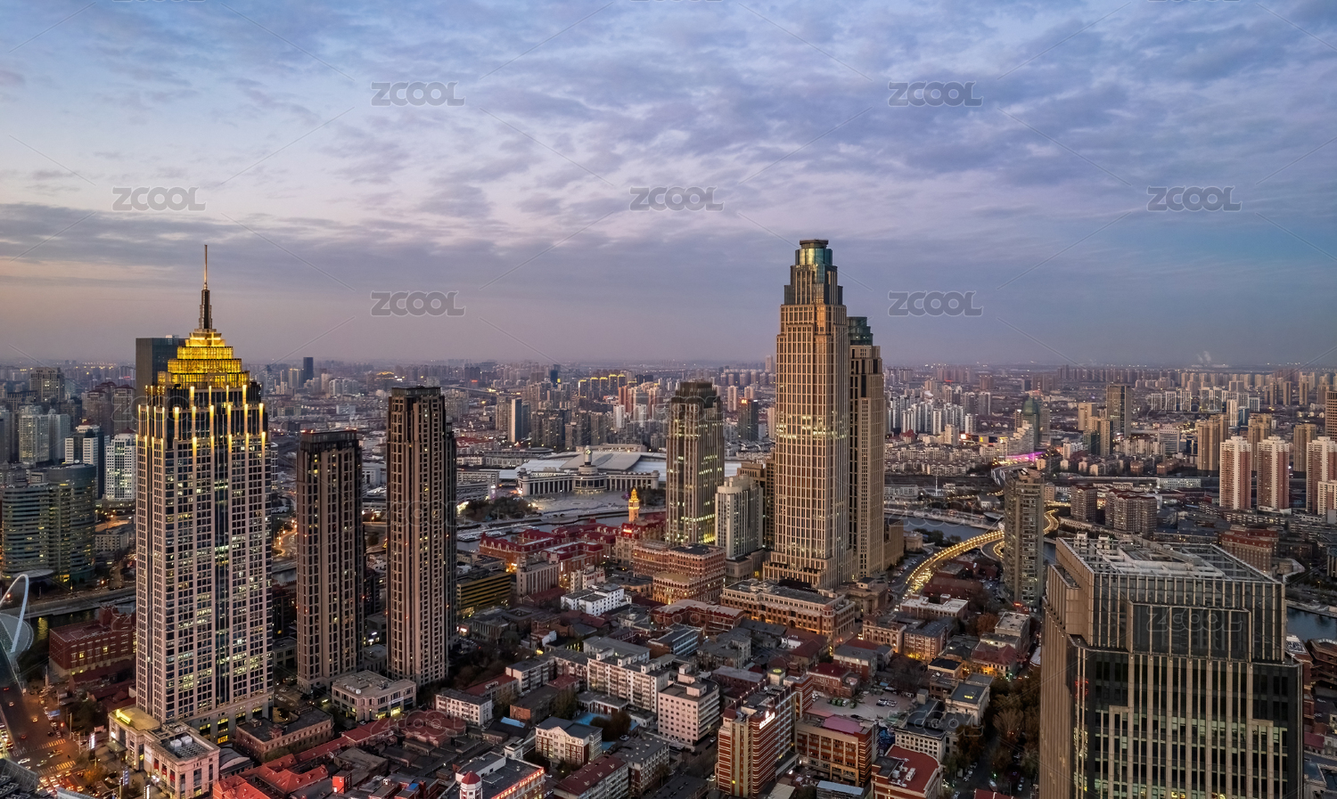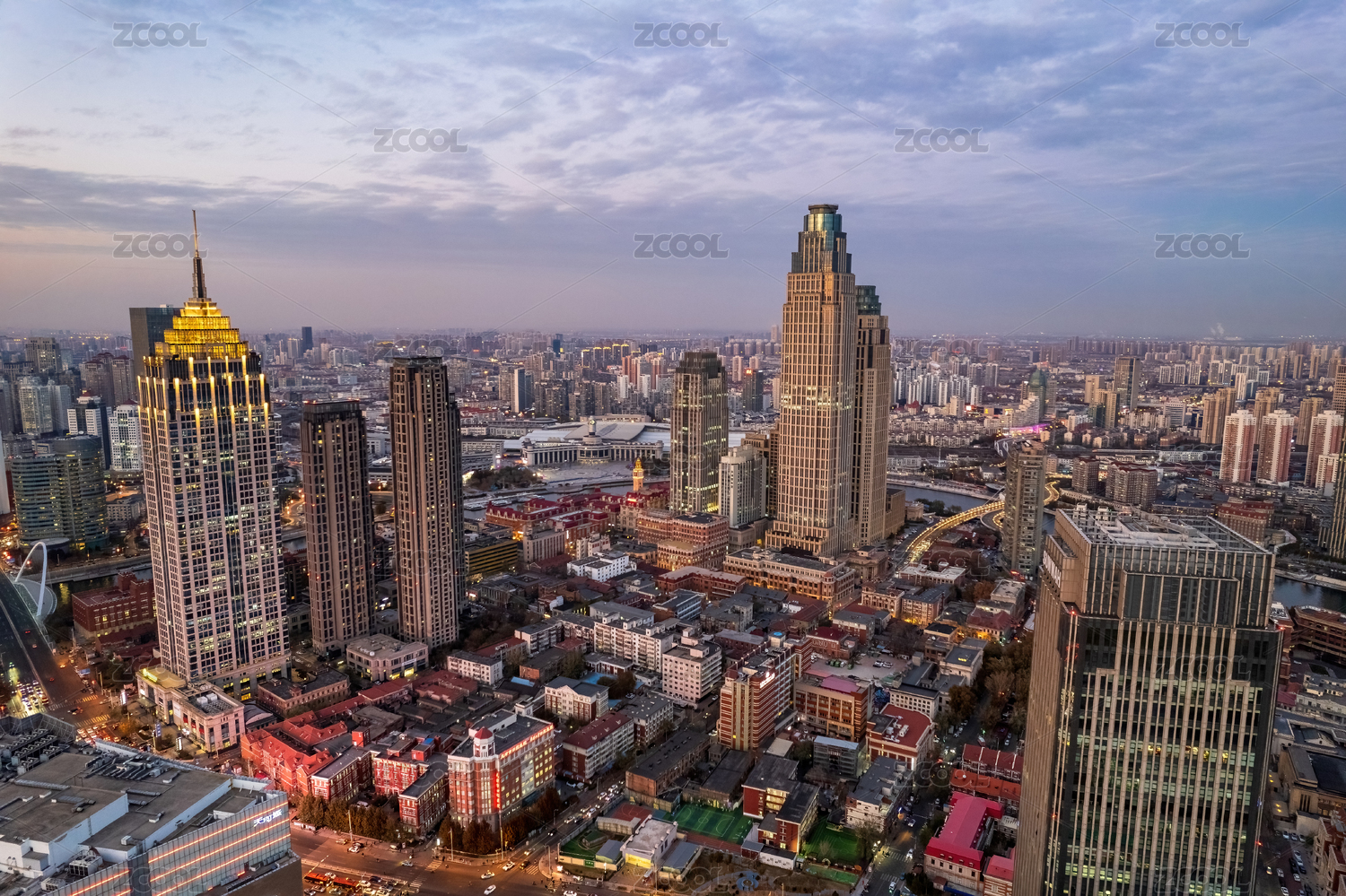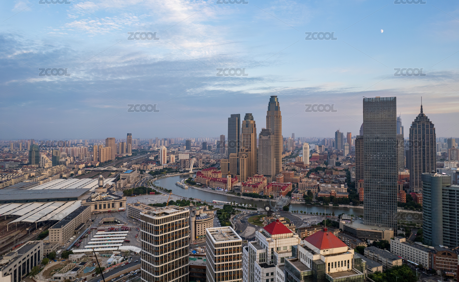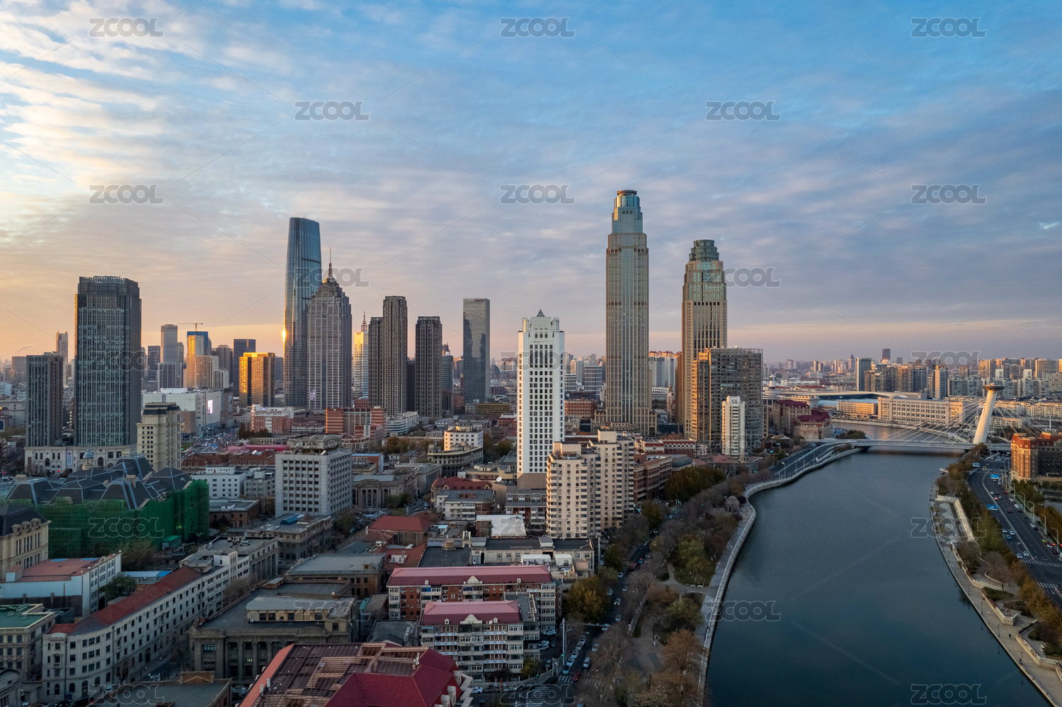 天津站海河津湾广场城市建筑日落晚霞航拍