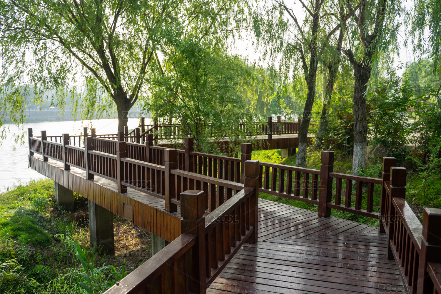 夏天早晨河畔木质栈道和垂柳