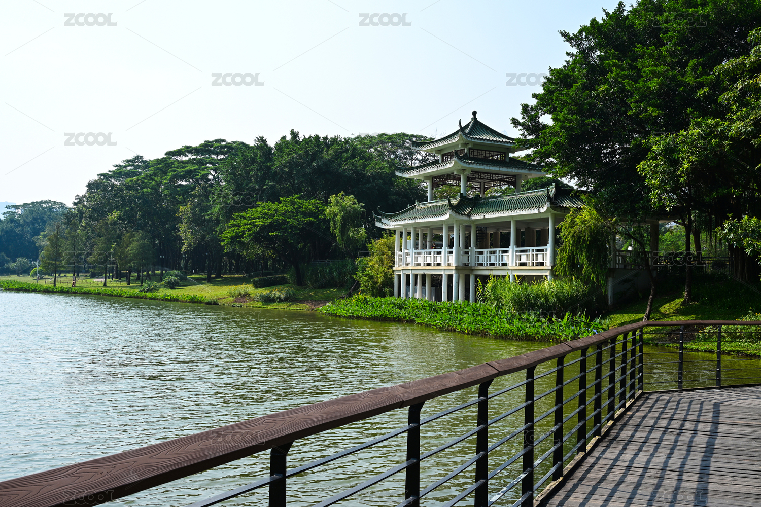 阳光下湖边中式楼阁与木质栈道景观