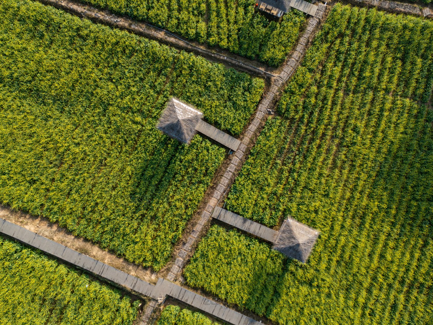 福建厦门天竺山航拍绿色农田与木质栈道小屋