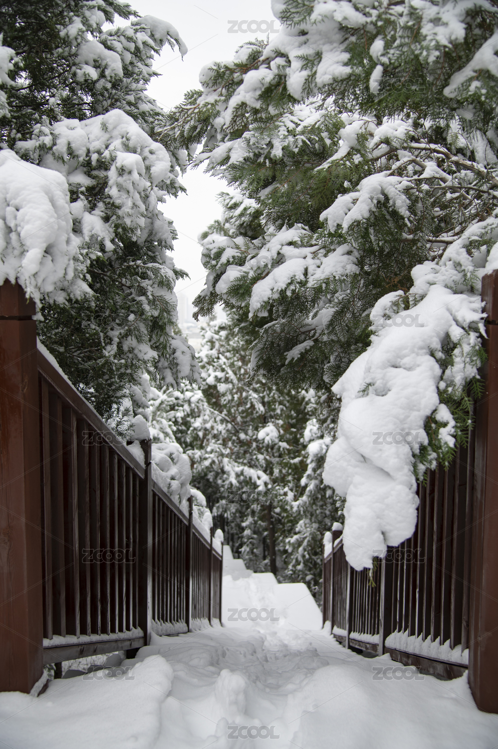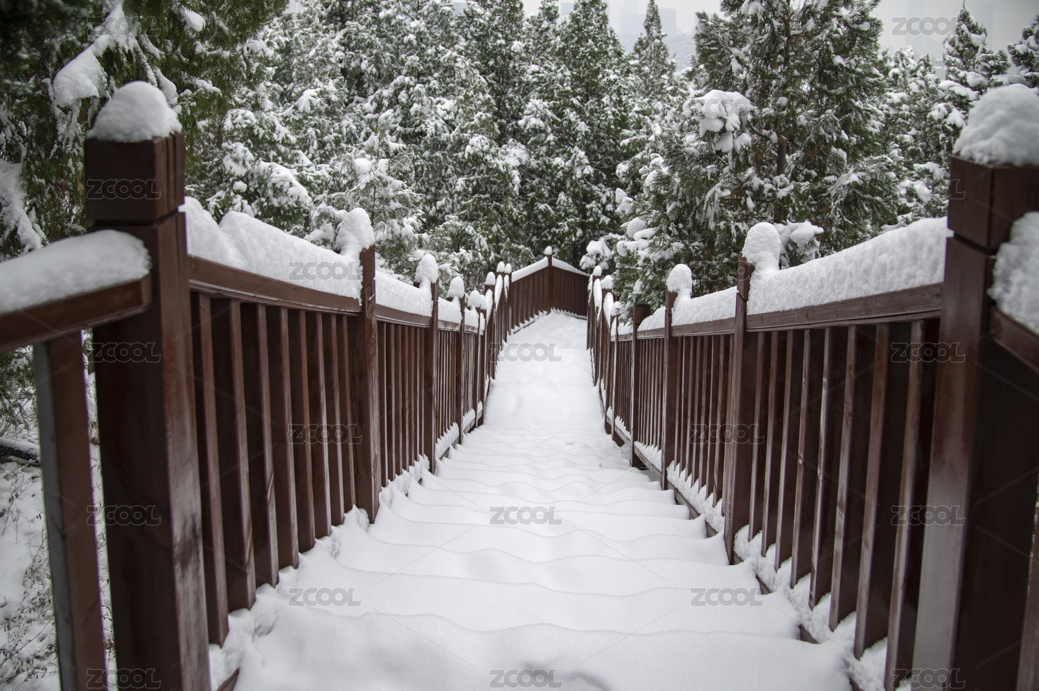 雪后济南大山坡山体公园内的木质栈道和大雪
