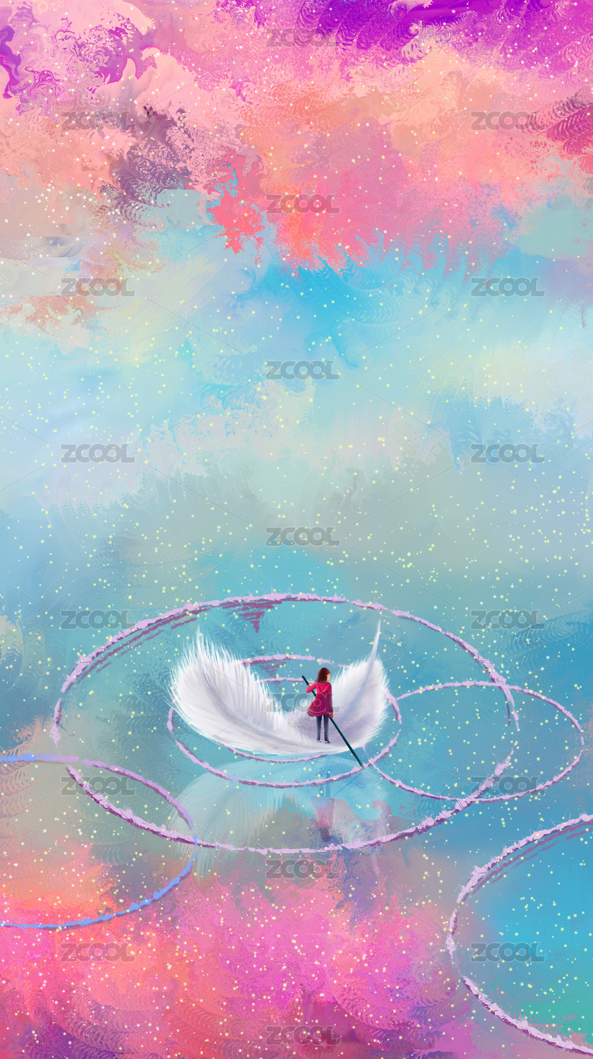 夏天男孩女孩皮筏艇漂流池塘荷叶荷花插画