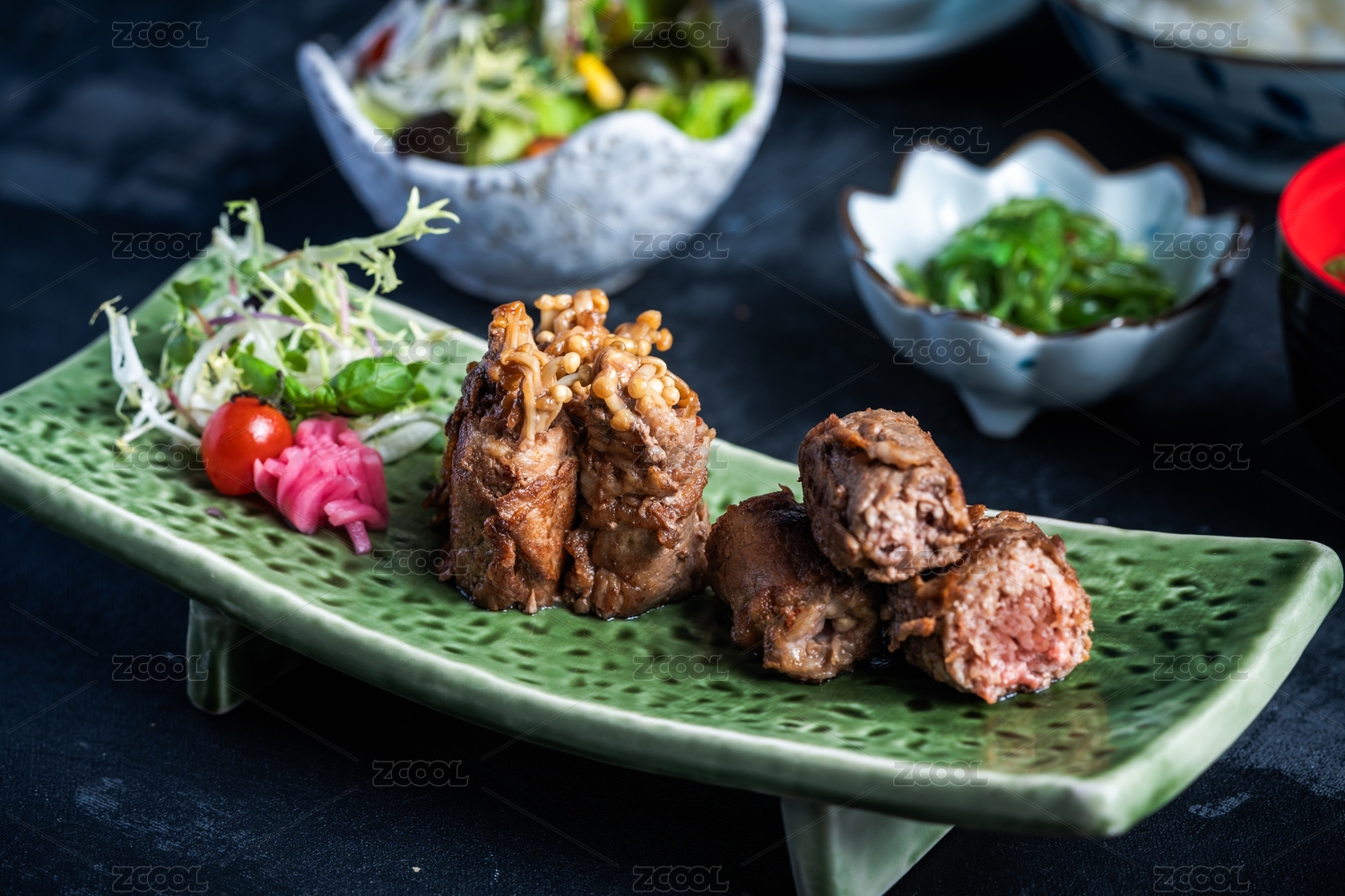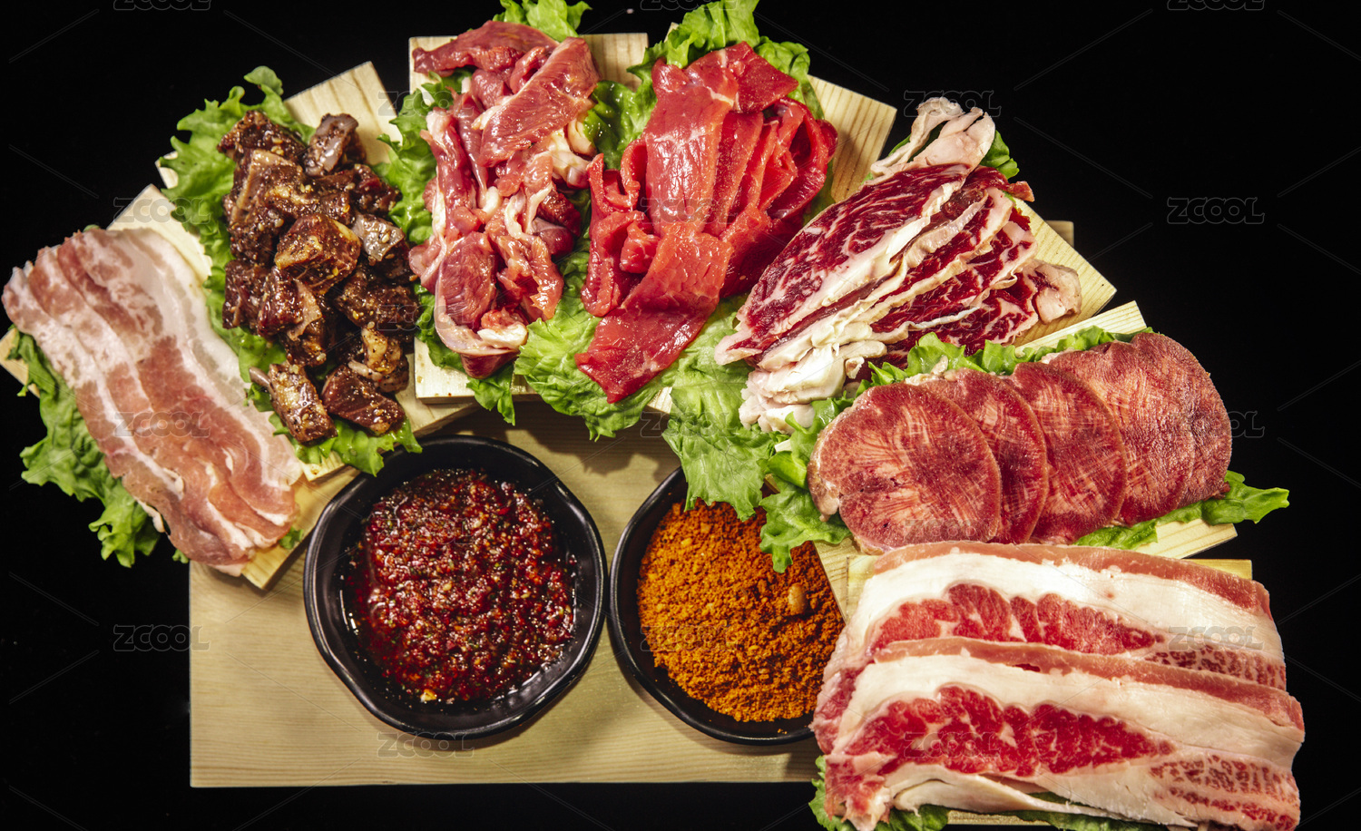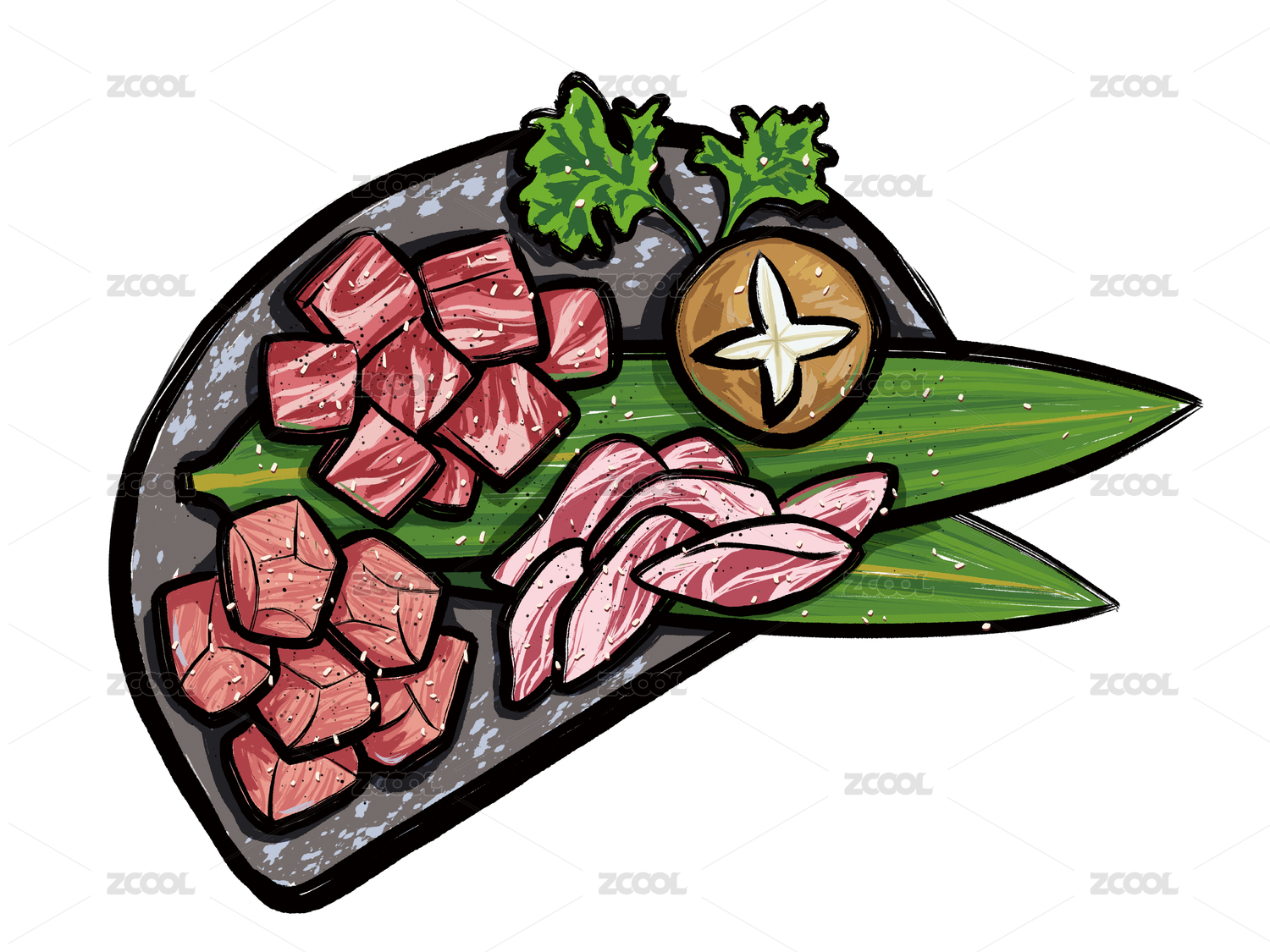 一盘有香菇牛肋条牛舌牛小粒的烤肉套餐