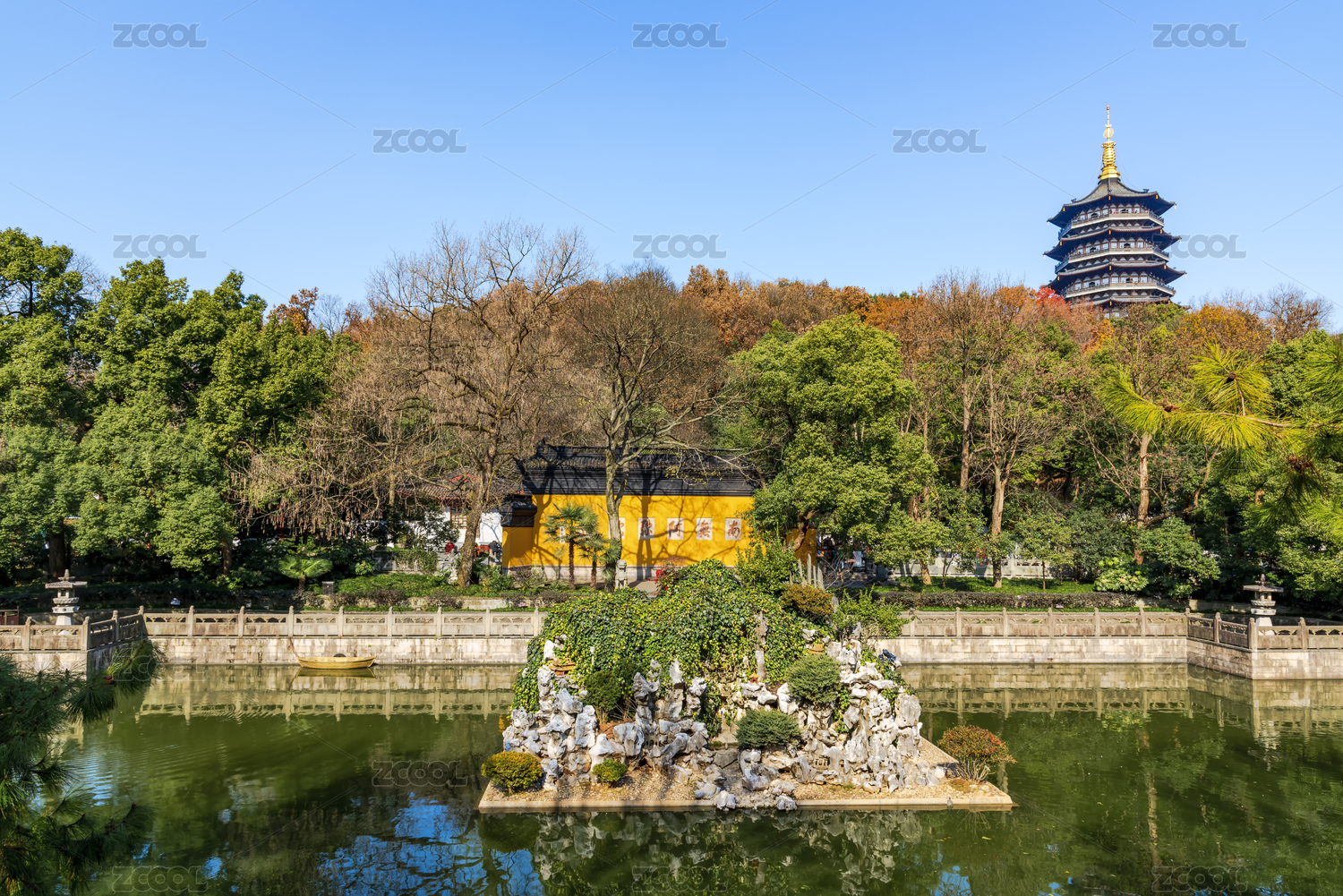 中国浙江杭州西湖秋景雷峰塔放生池