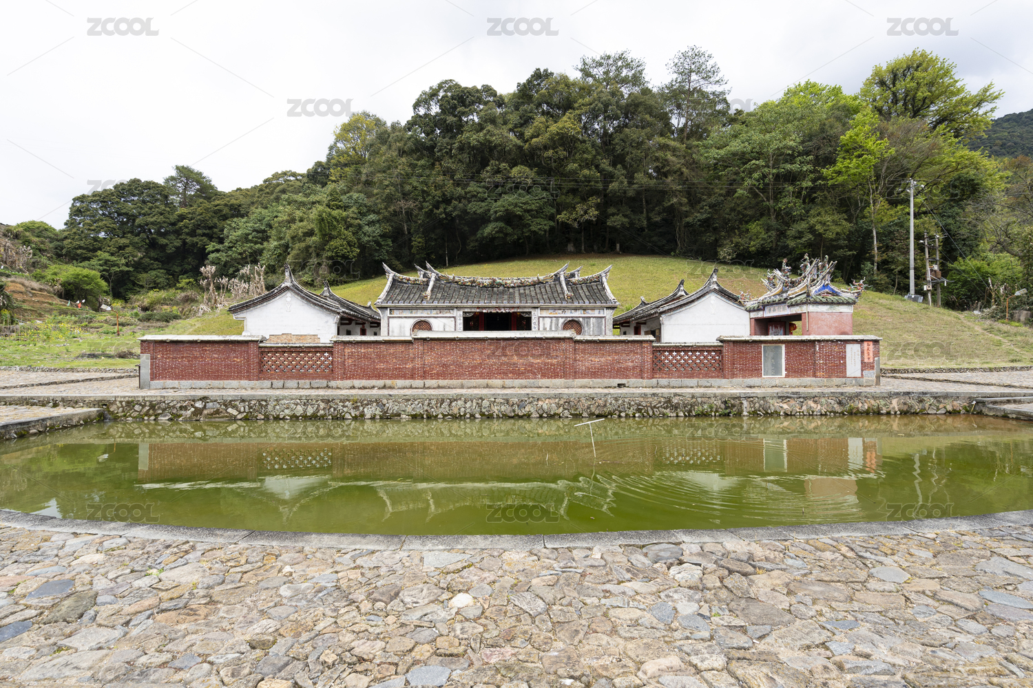 中国福建南靖一家宗祠前的放生池及背靠的风水林