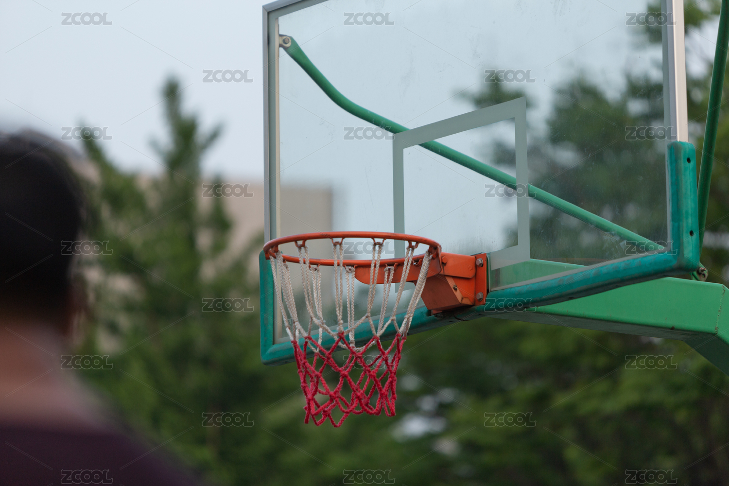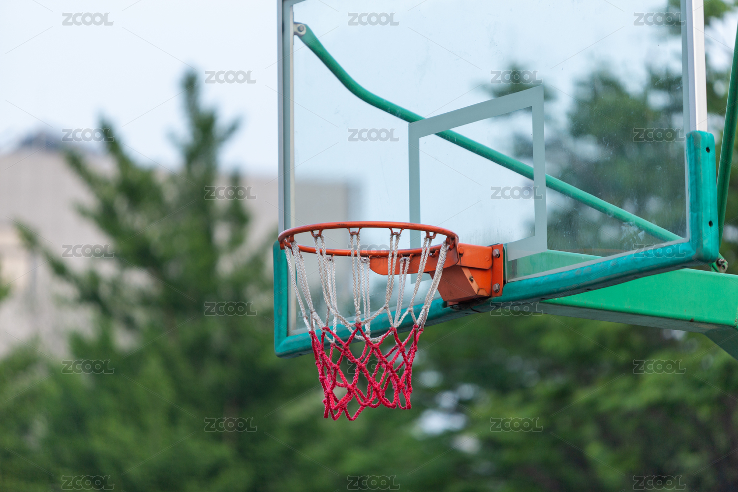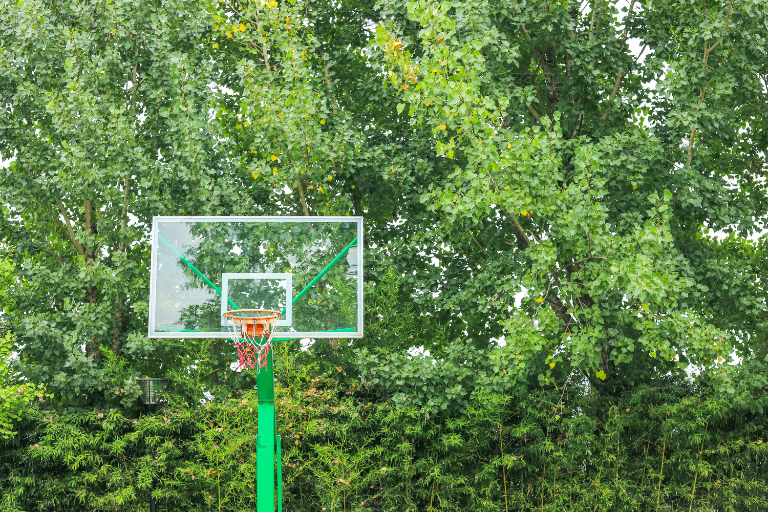 户外绿色树木背景中玻璃篮球板
