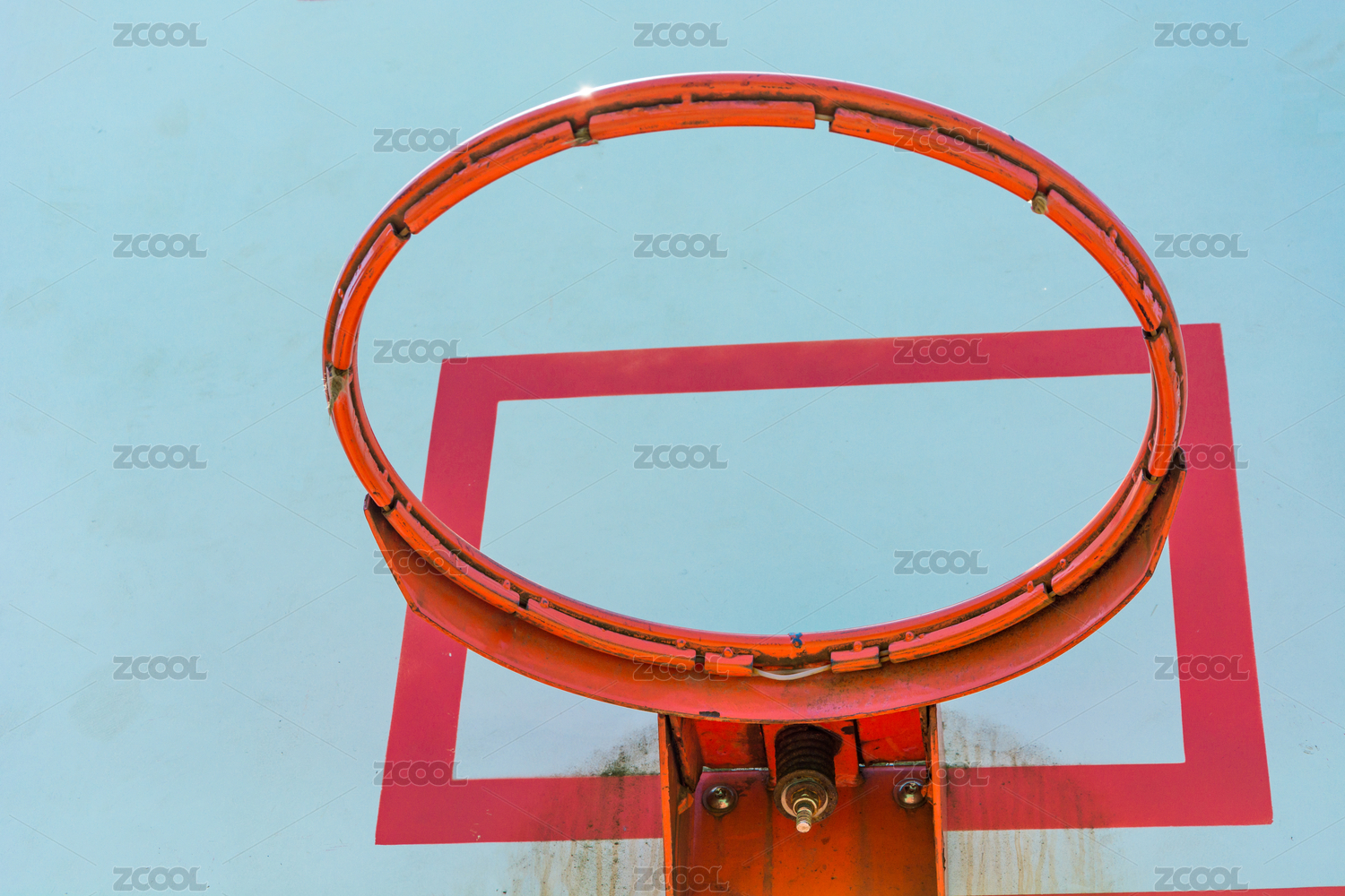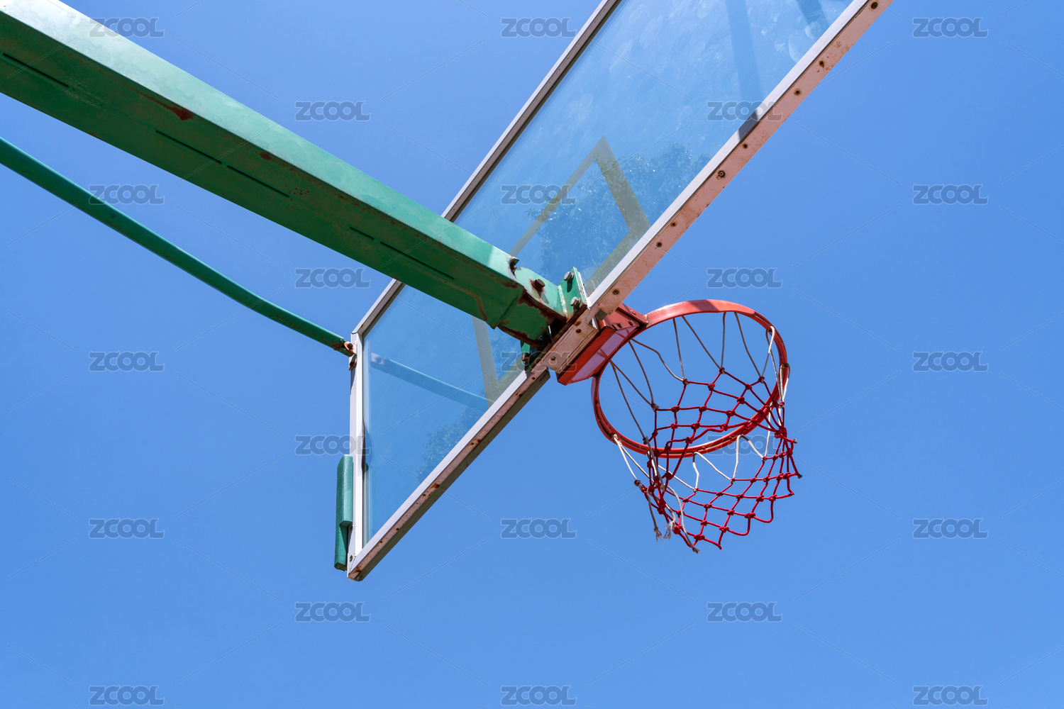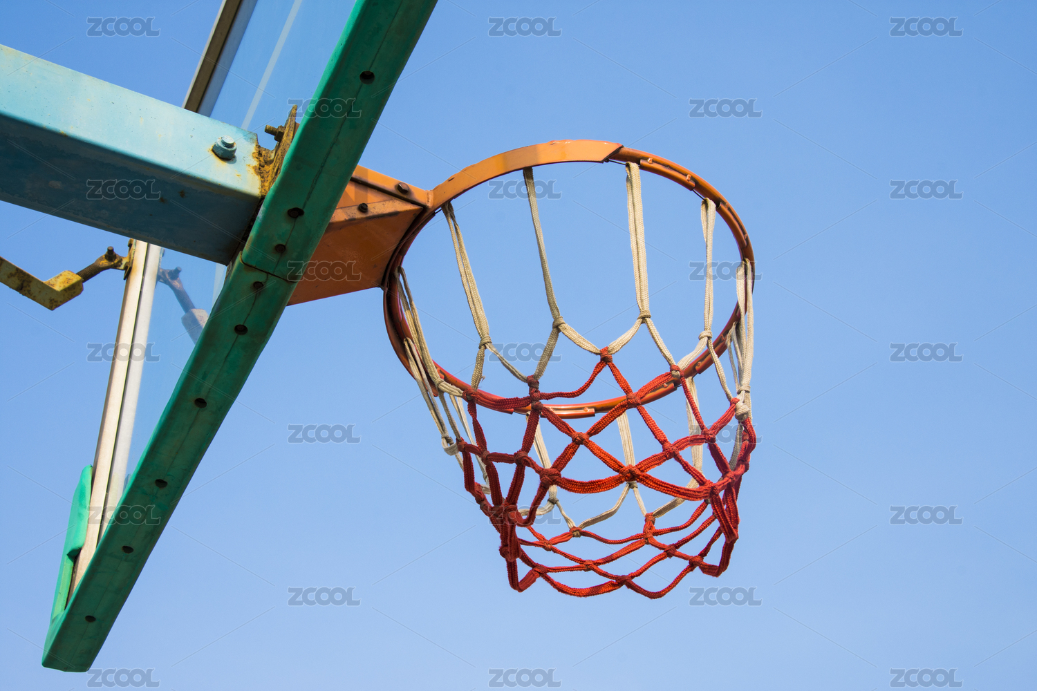 阳光下,操场上的红色篮球框网
