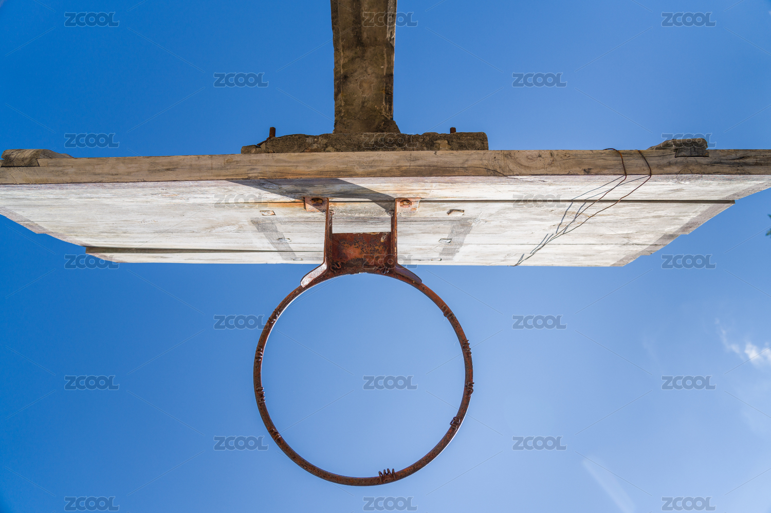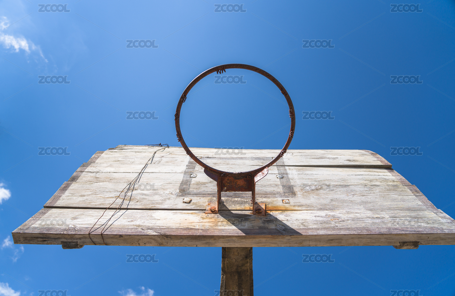 蓝天下铁丝缠绕的破旧篮板与篮筐仰拍