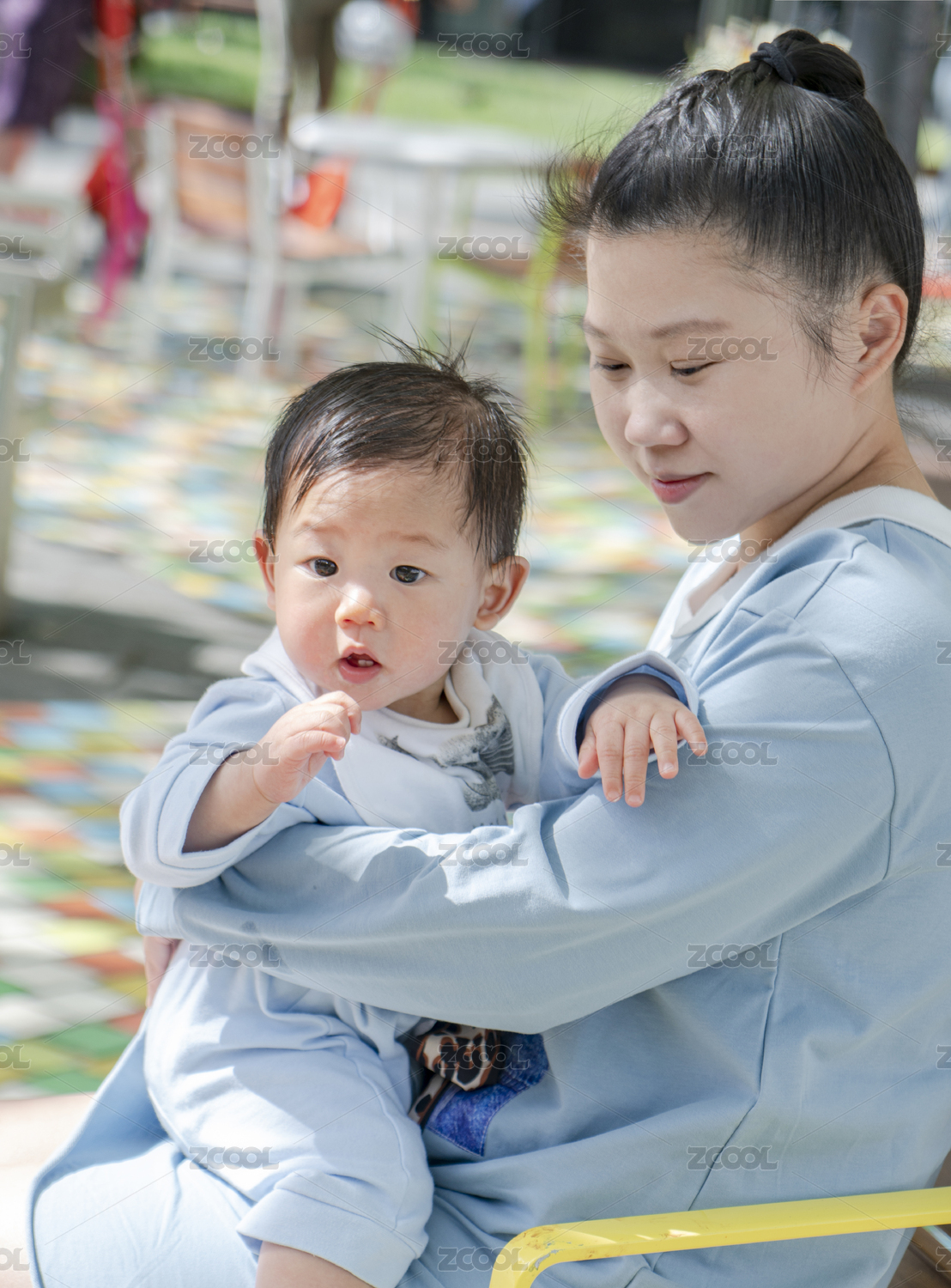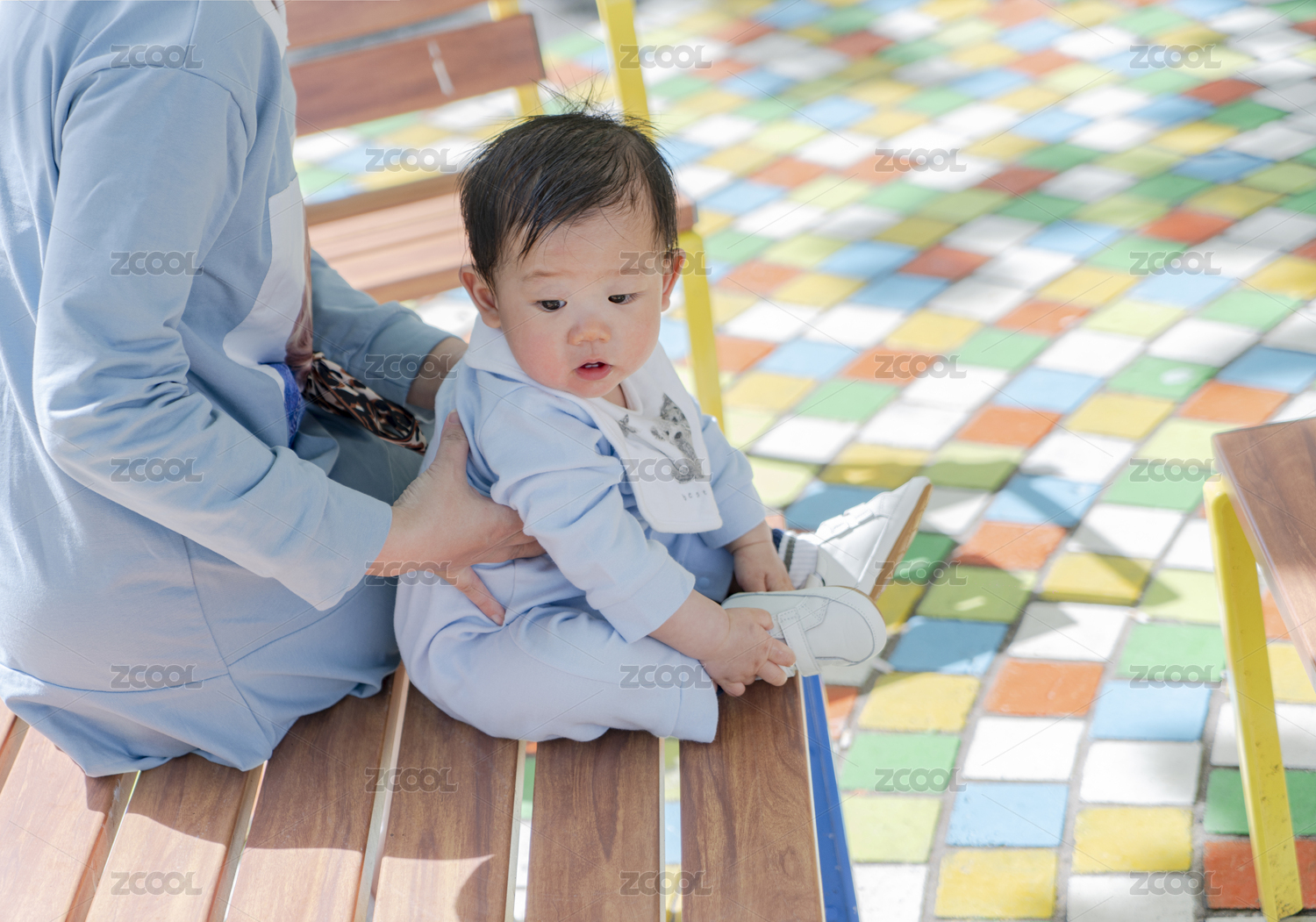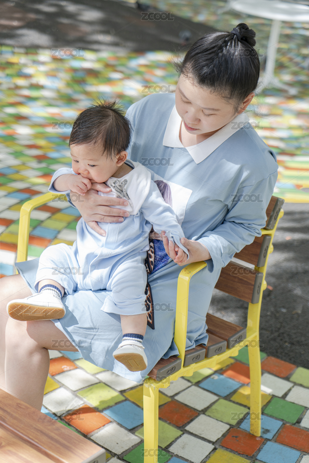 坐在公园座椅上母婴俩