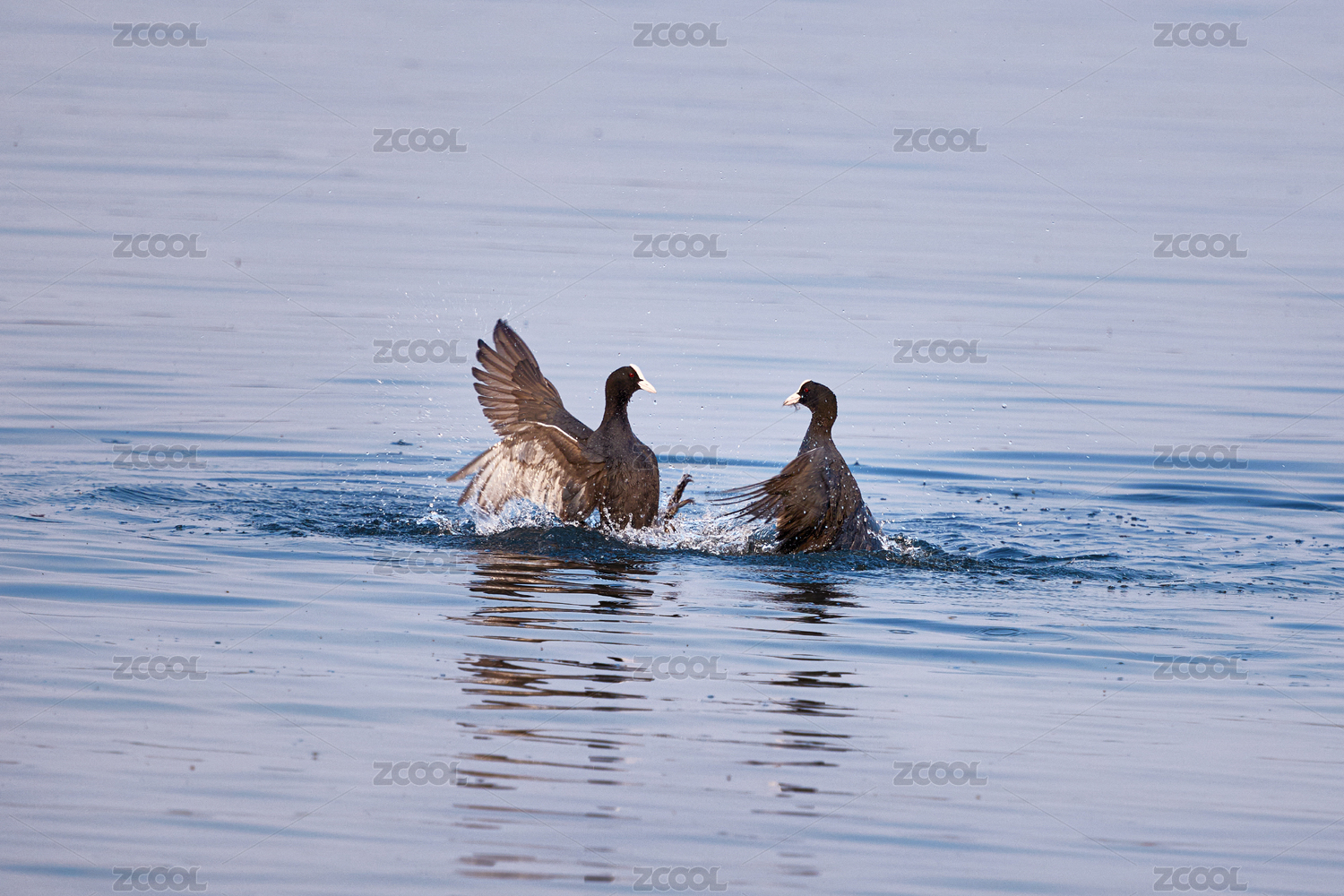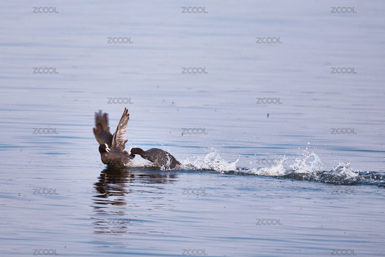 在野外湖泊水上追逐嬉戏的白骨顶鸡