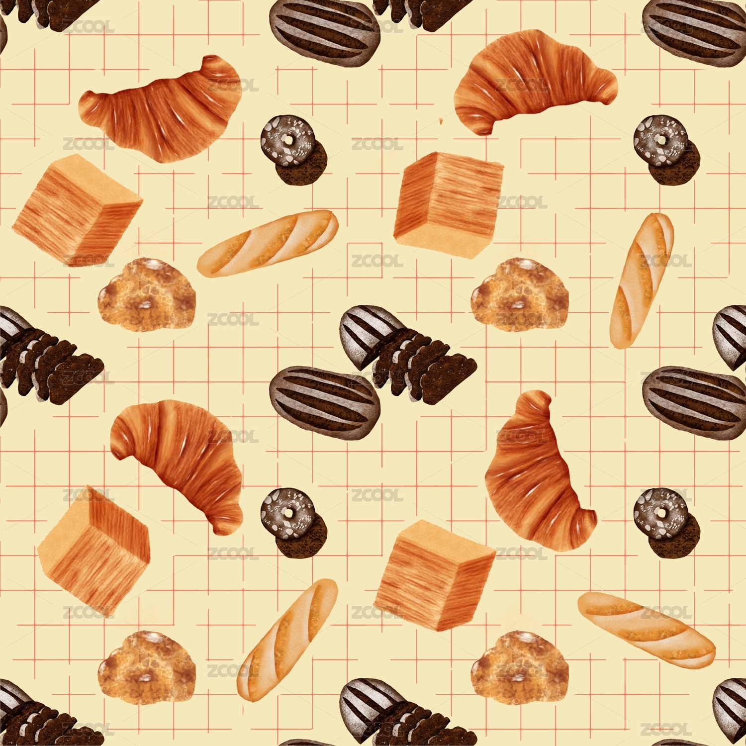 各种面包点心无缝连续-插画