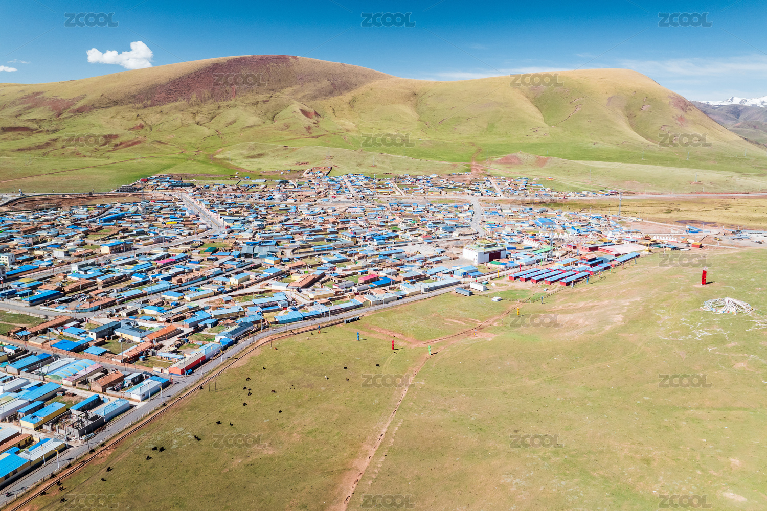 中国青海玉树曲麻莱县雪域高原下的城市户外