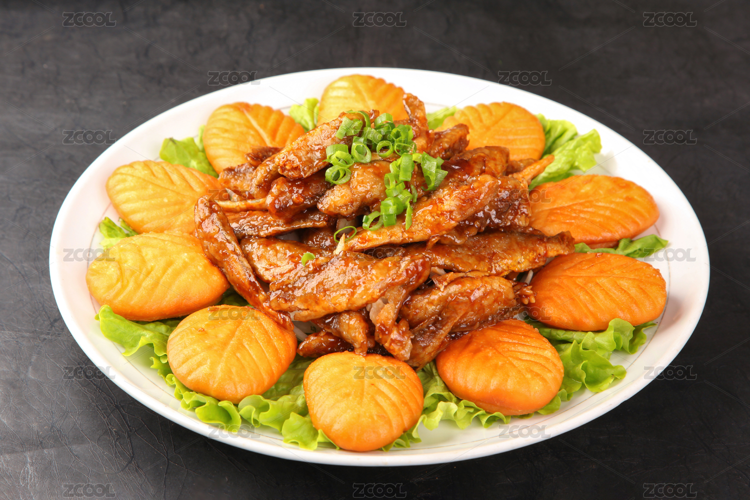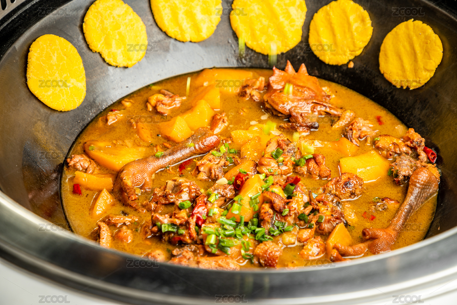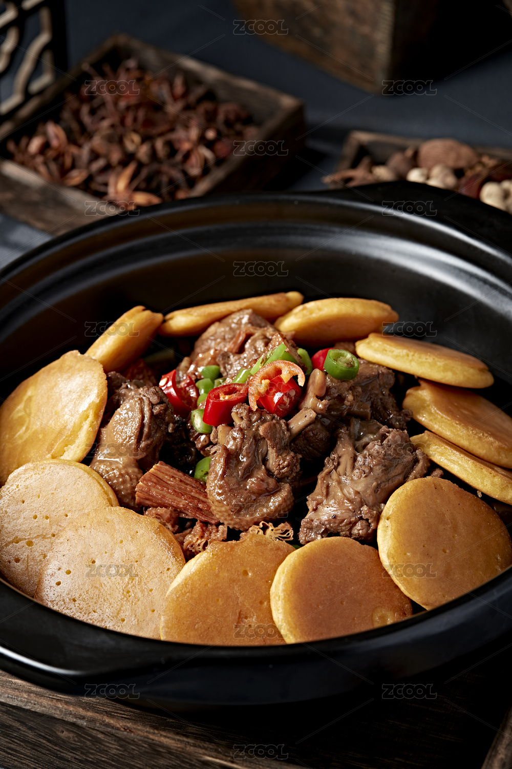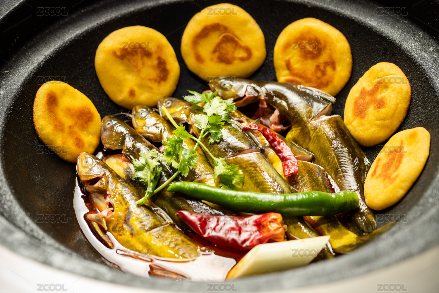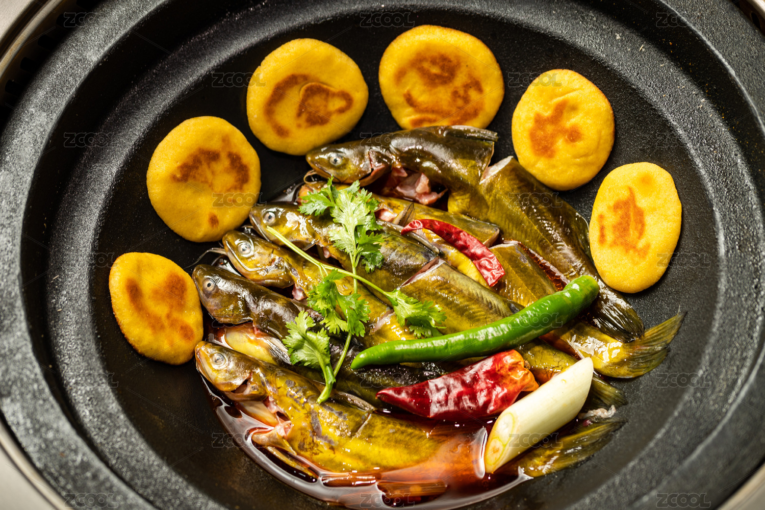 一位厨师在制作传统东北菜,铁锅炖的贴饼子