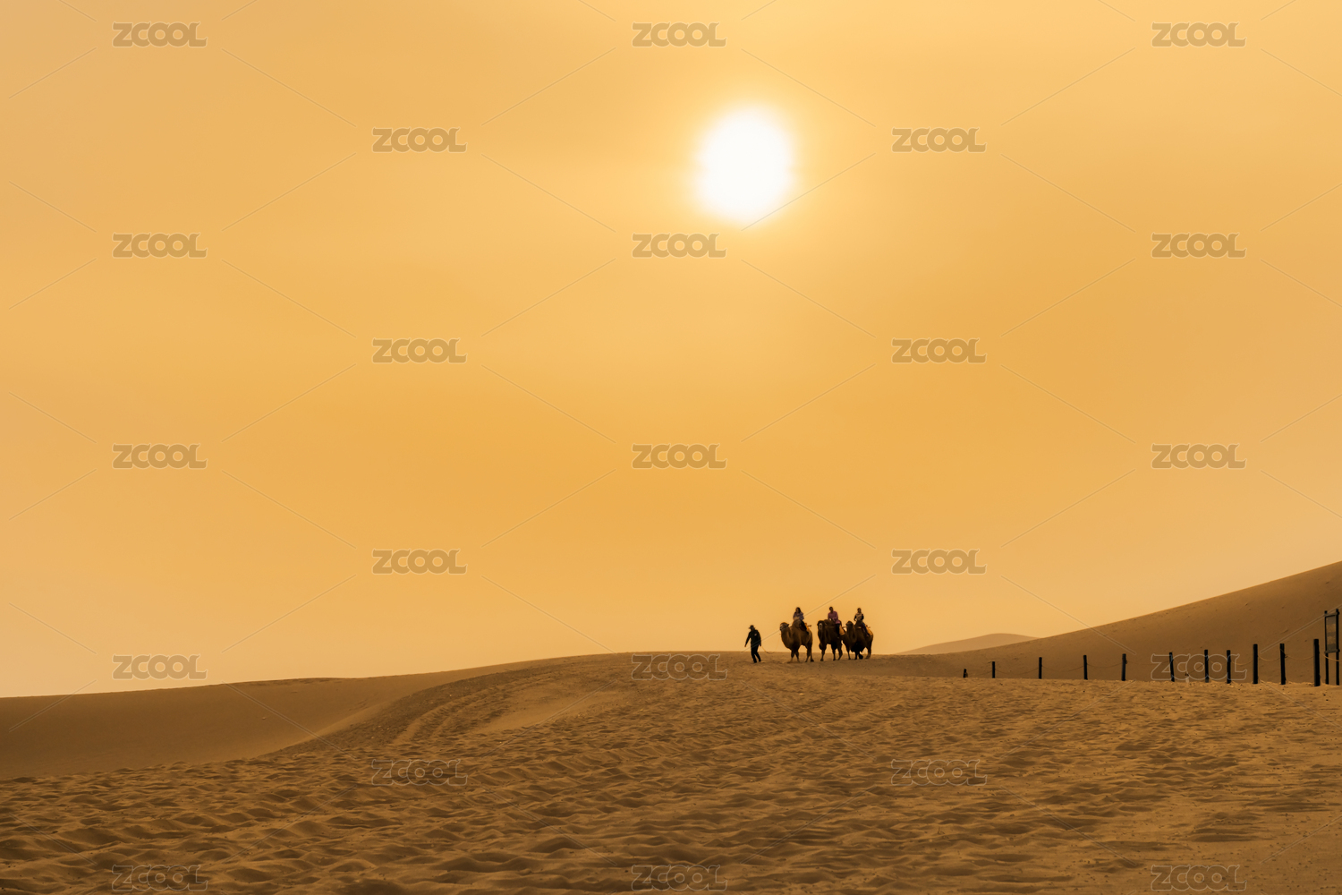 阳光下骑行在敦煌鸣沙山上的骆驼队