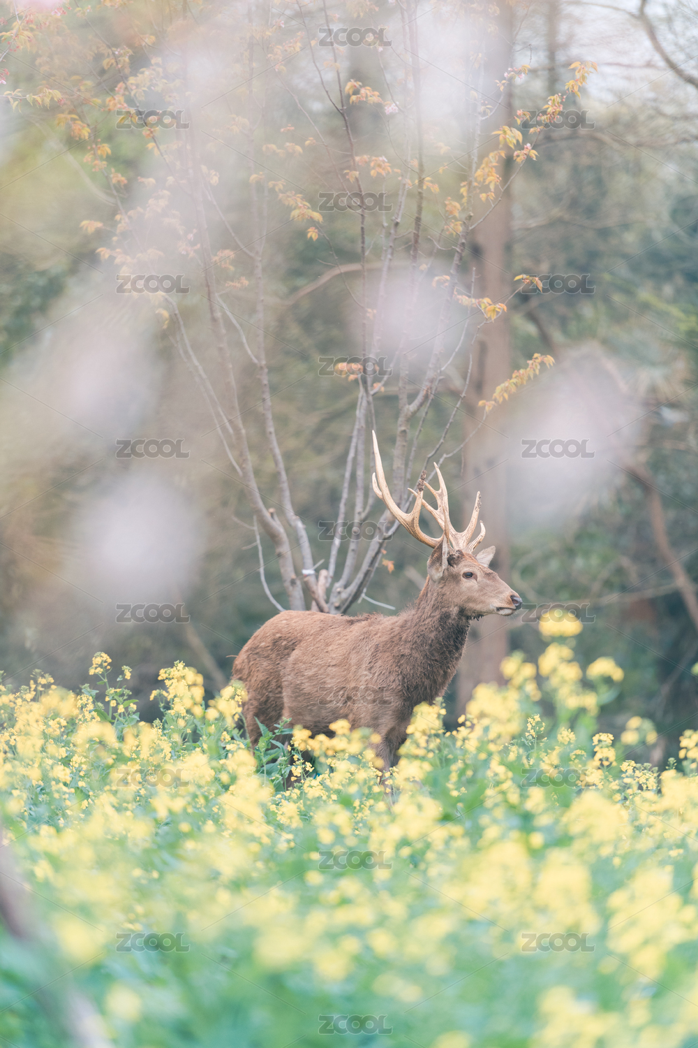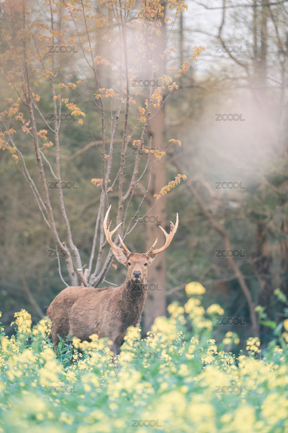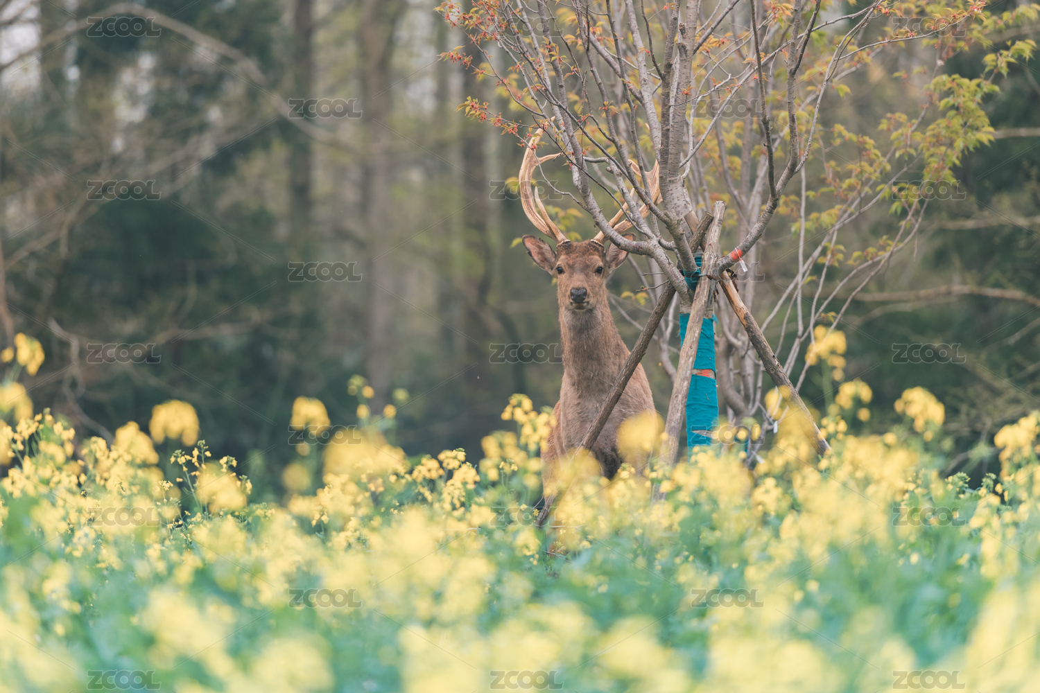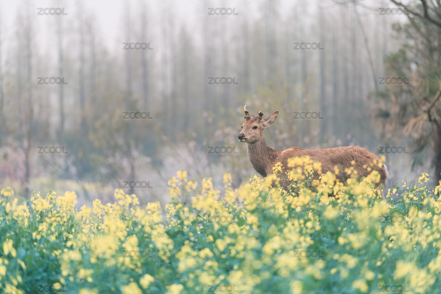 上海崇明东平国家森林公园的鹿和油菜花