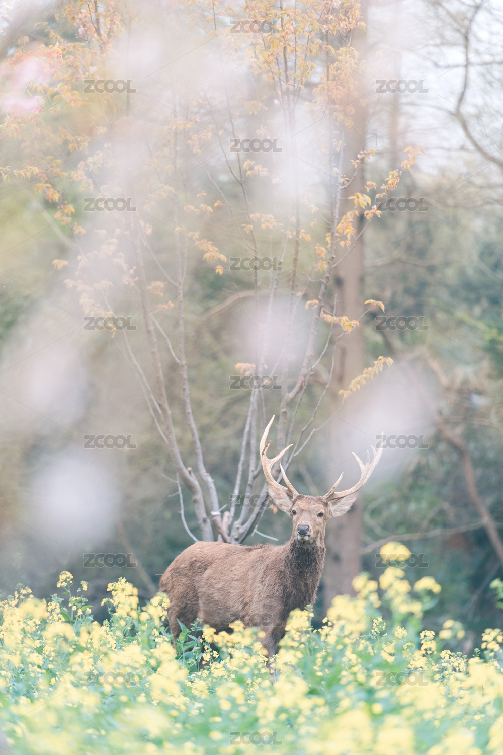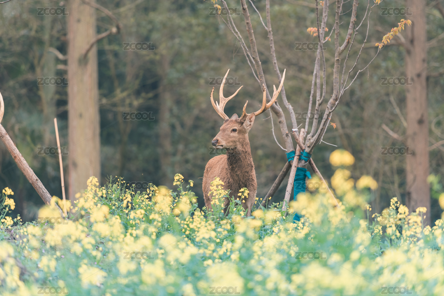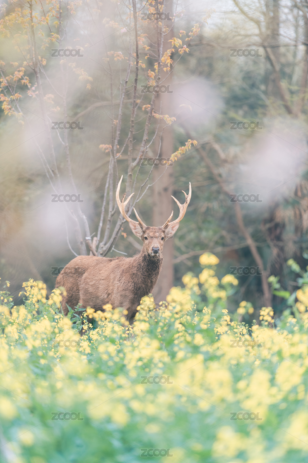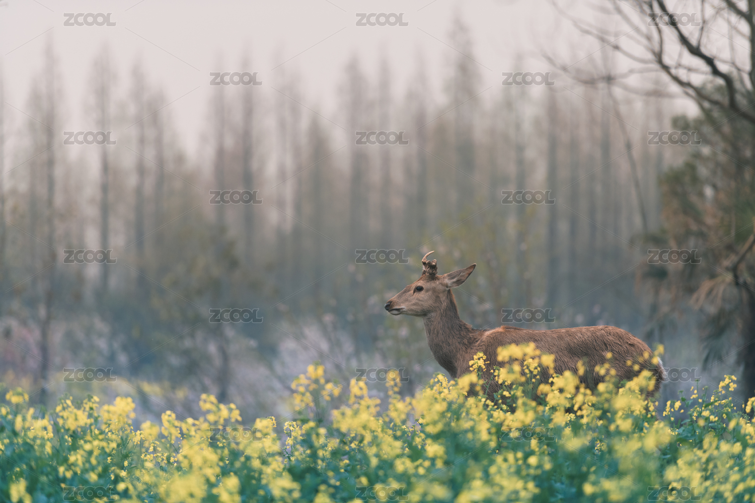 上海崇明东平国家森林公园的鹿和油菜花