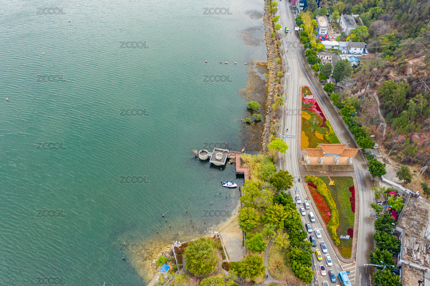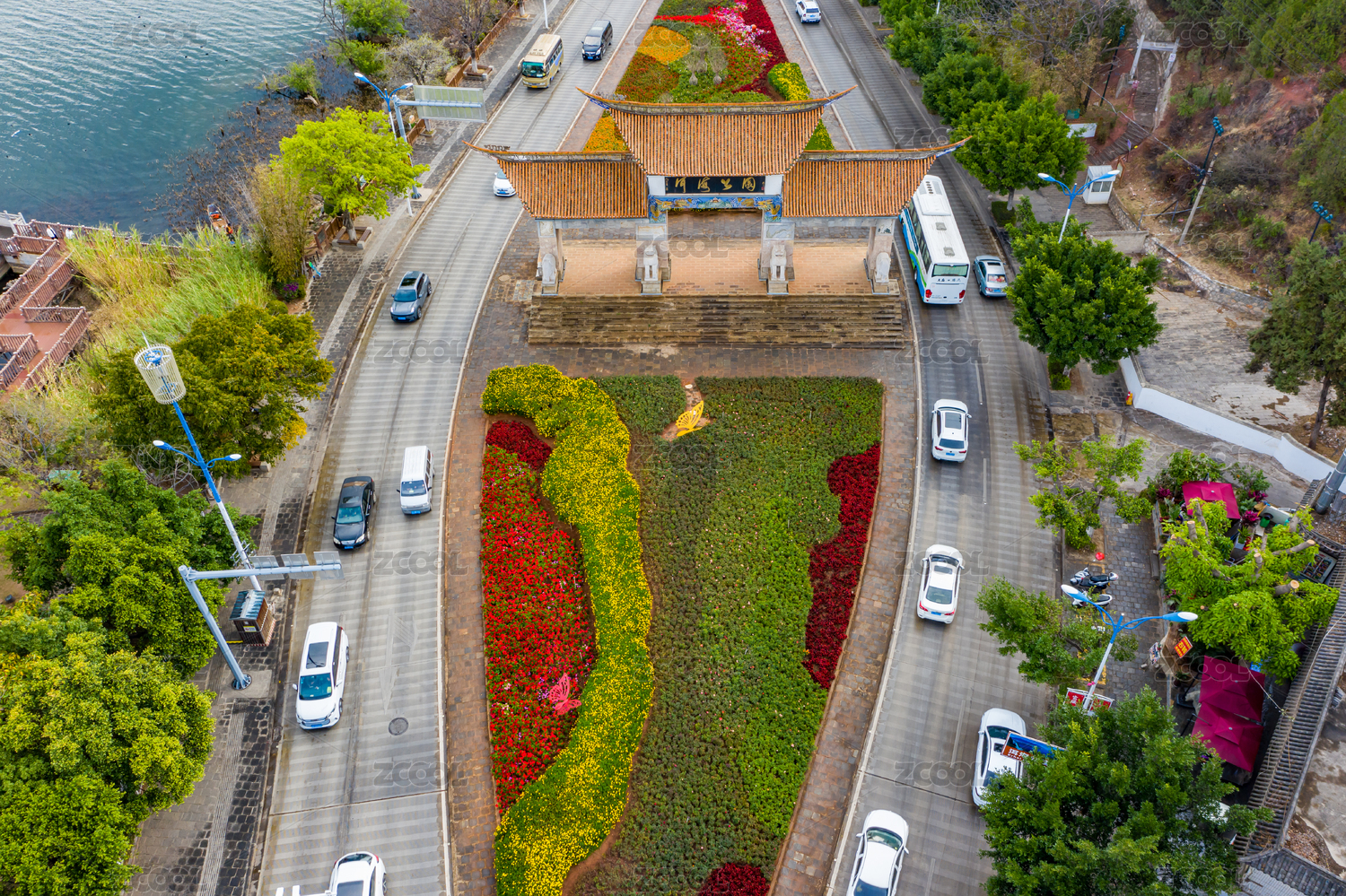 航拍云南大理洱海公园牌坊城市道路沿湖步道