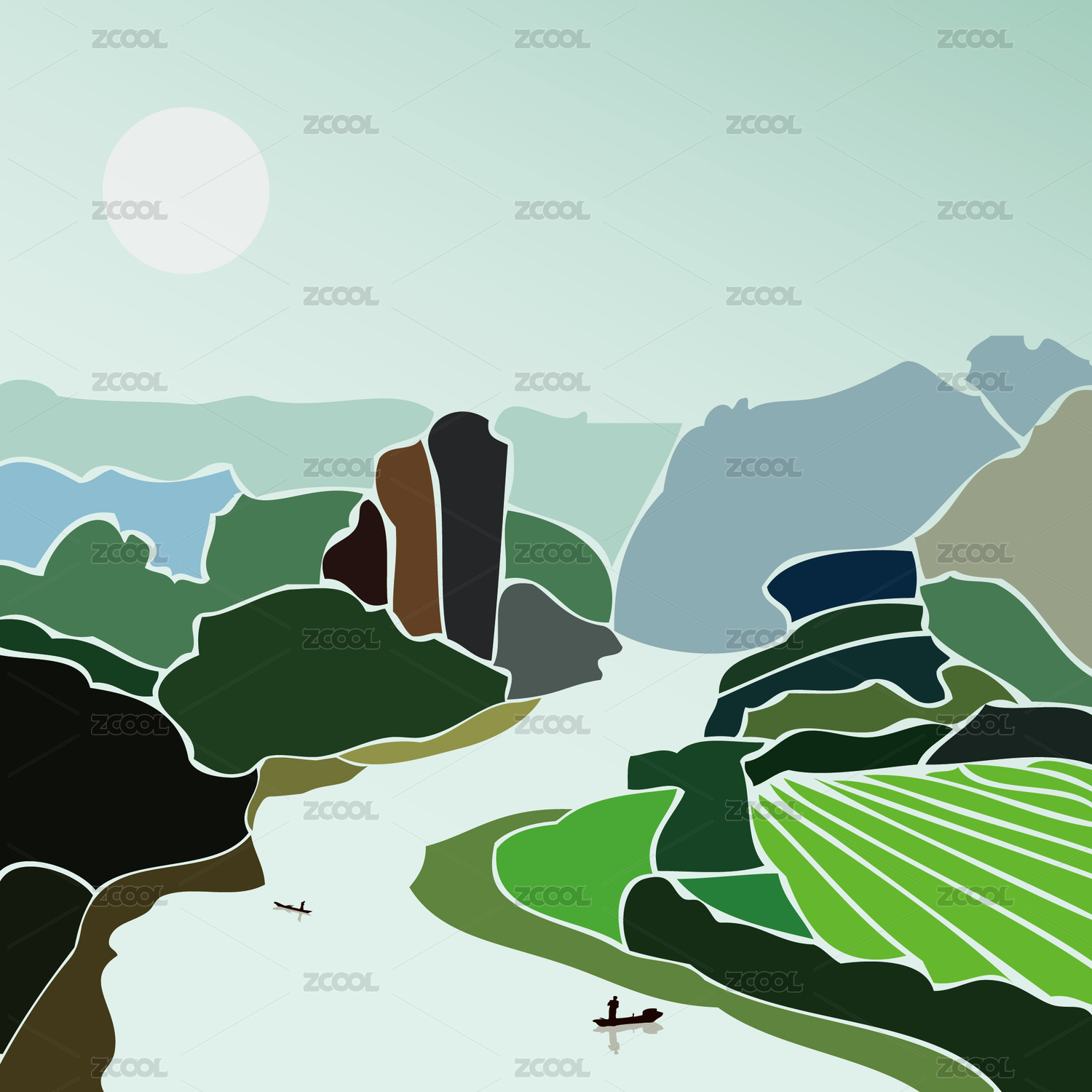 桂林山水 河流渔舟 田野 水墨风景剪影