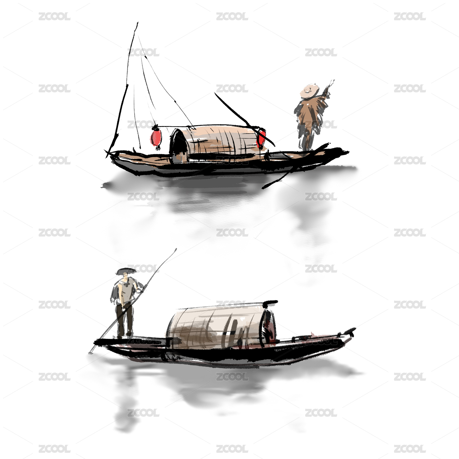 水墨渔舟渔船手绘
