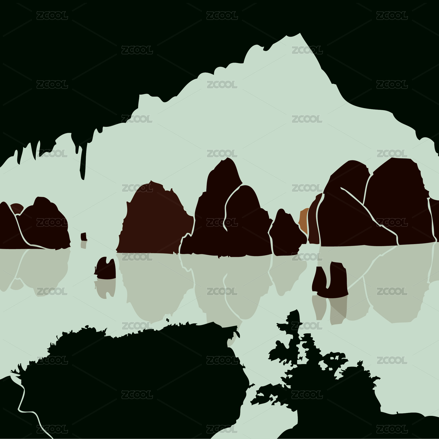 桂林山水百魔洞 渔舟 倒影 水墨风景矢量剪影