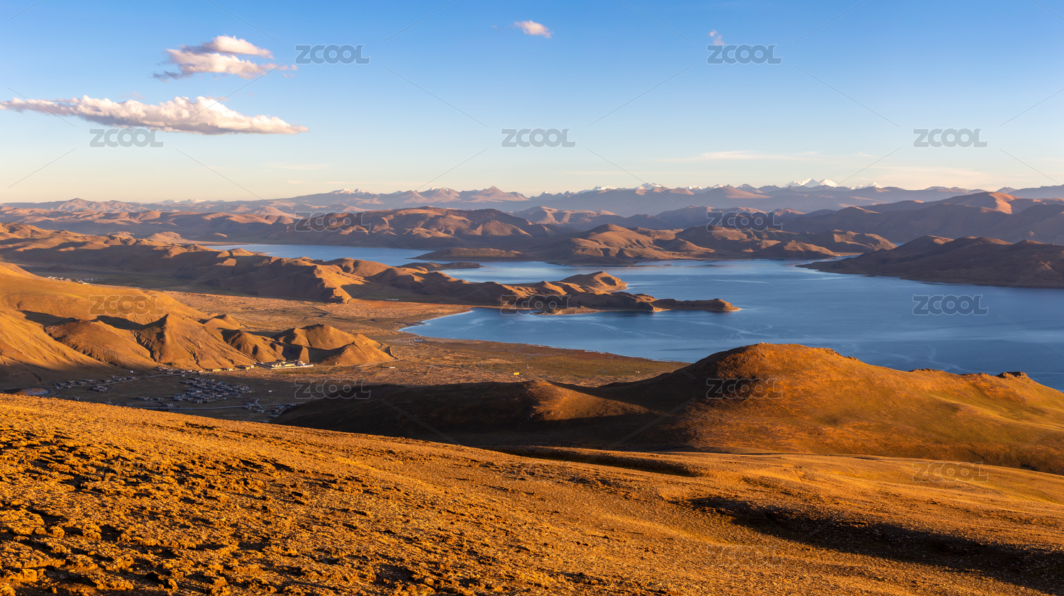 中国西藏山南东边日出西边雨的羊卓雍措全景