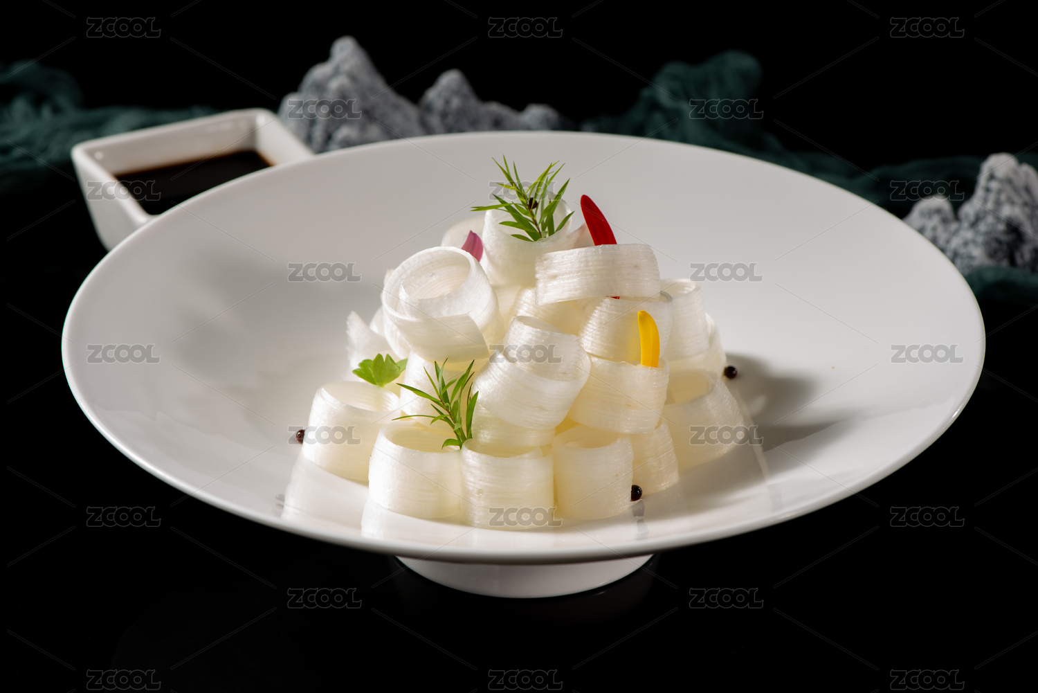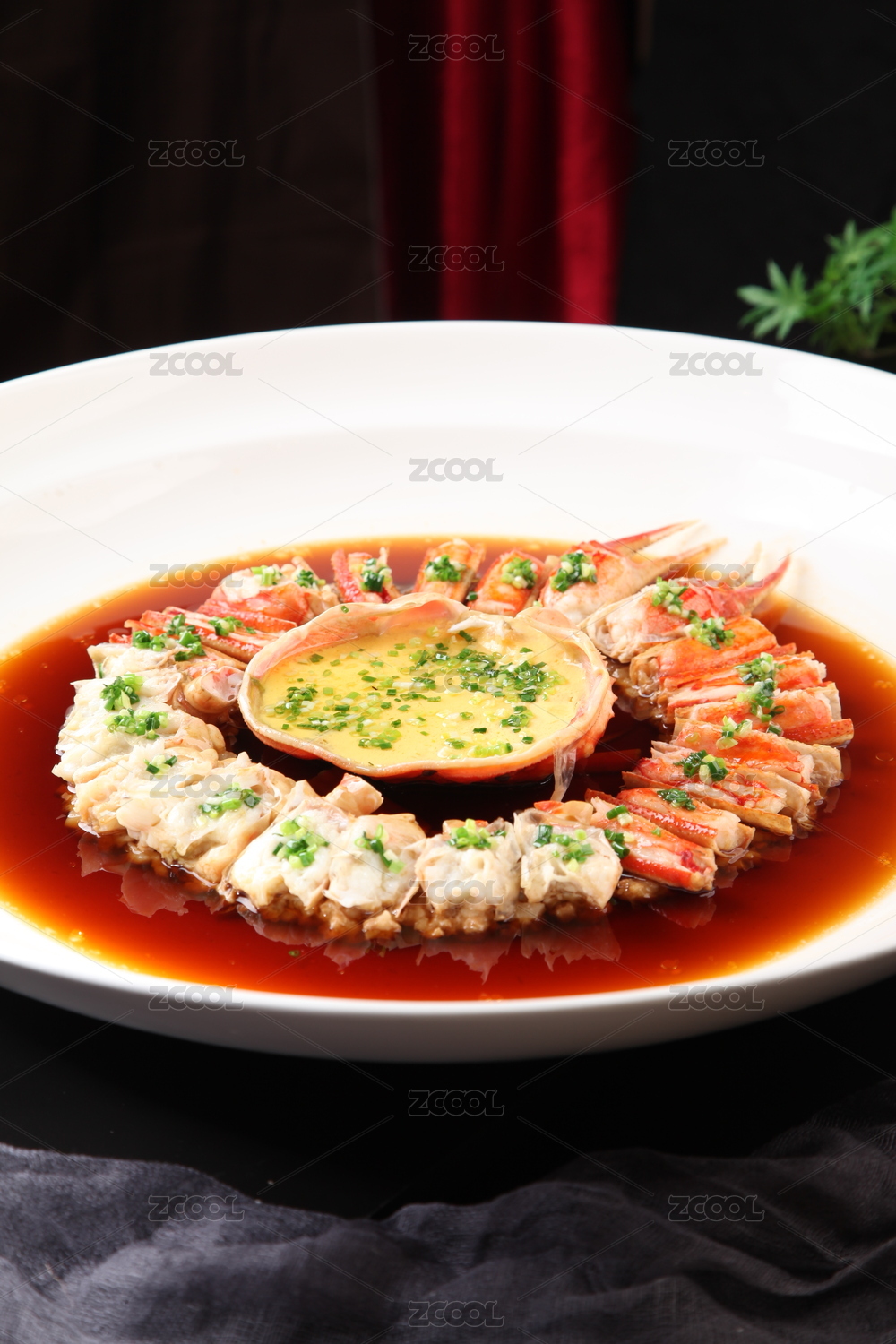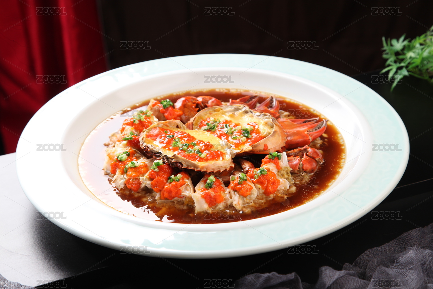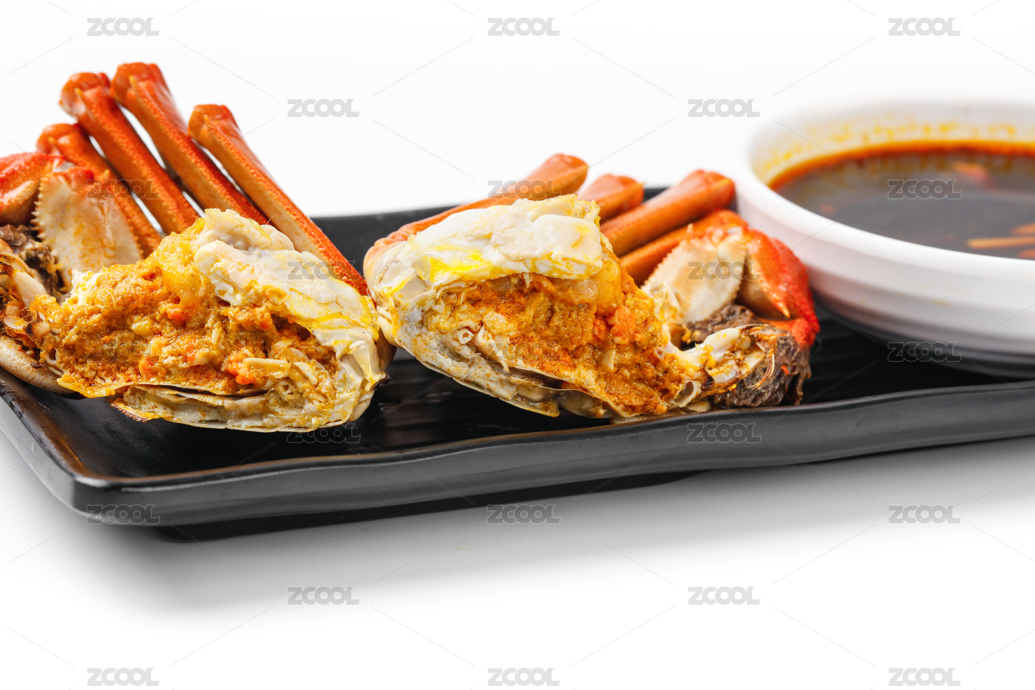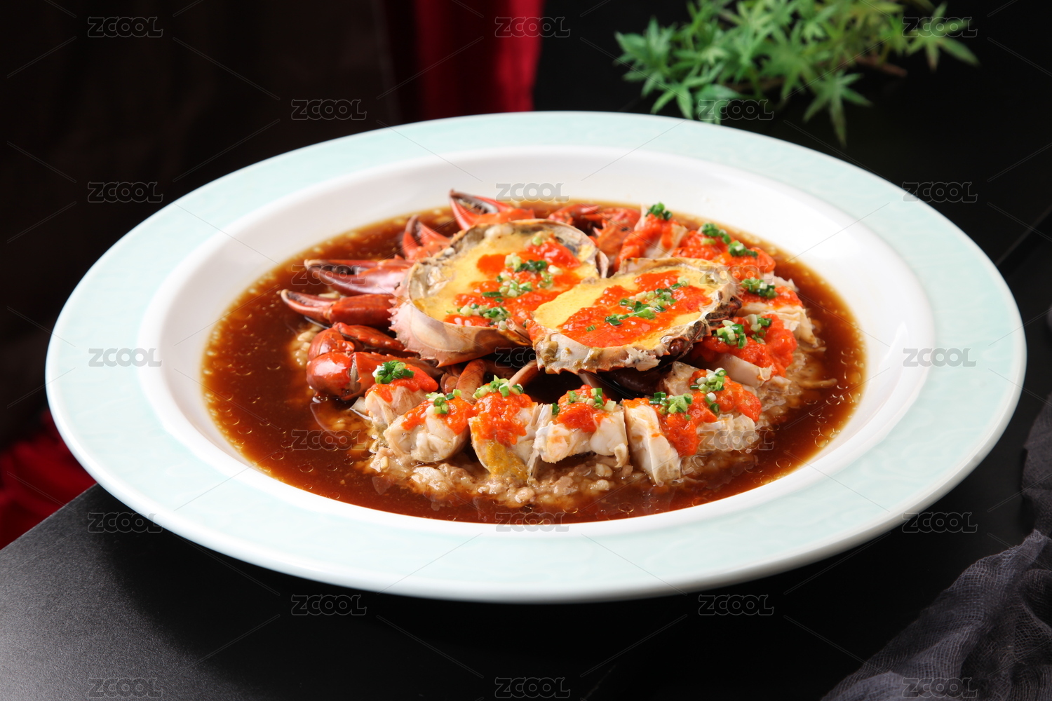 白底黑盘子上剥开的大闸蟹蟹黄和醋汁