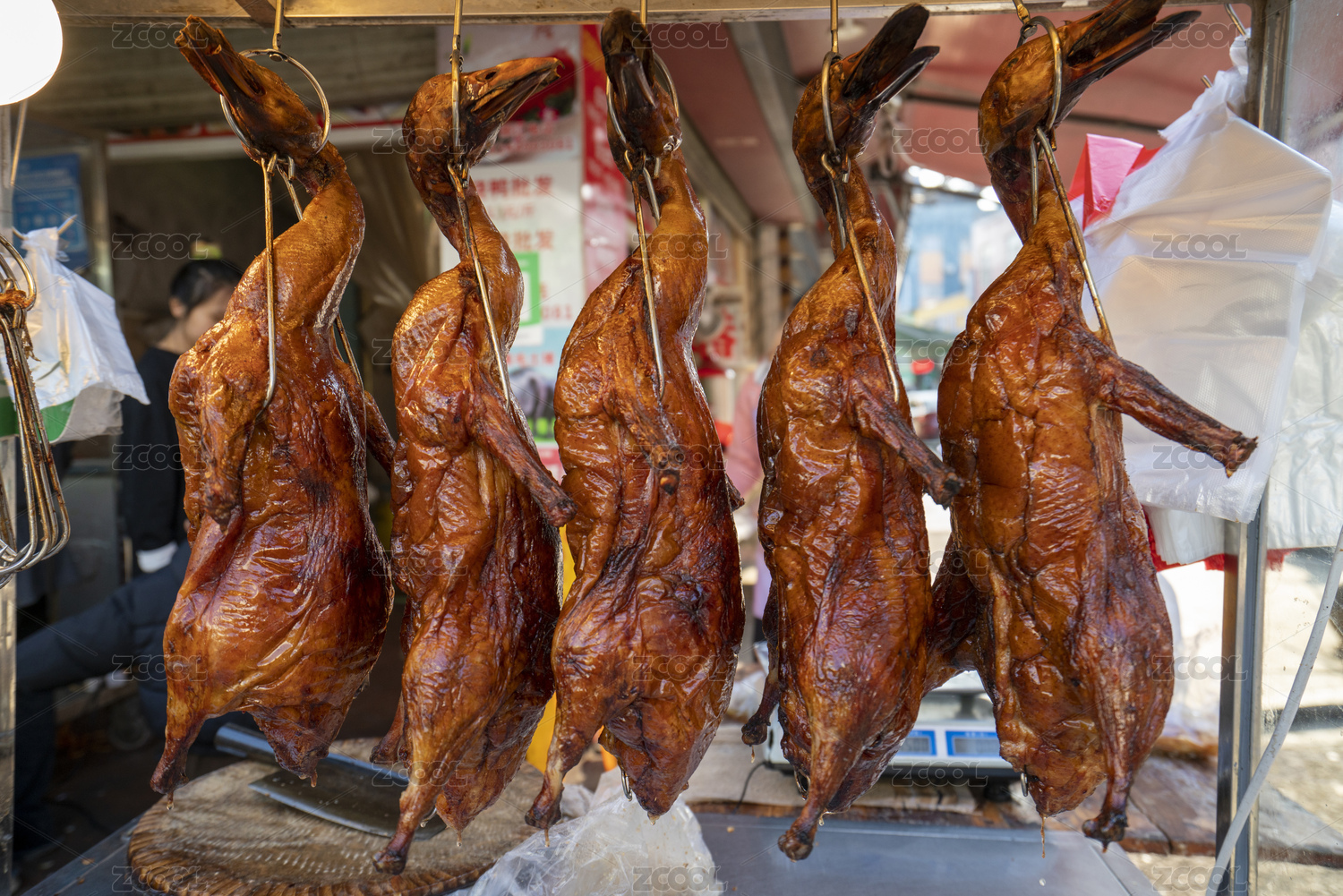 广东烧腊店里新鲜出炉的脆皮烧鸭