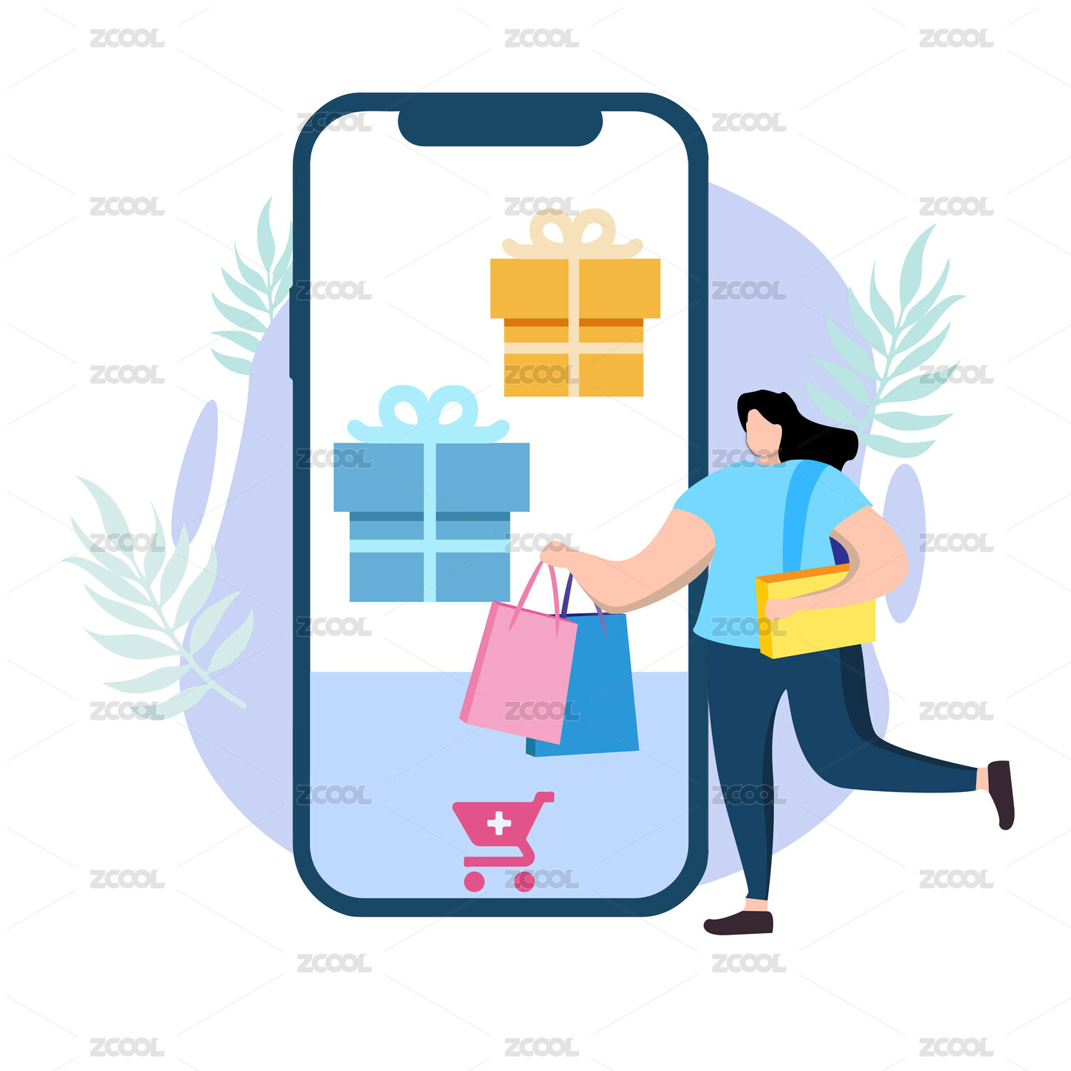 女人用手机添加礼物后拿着购物袋去结账