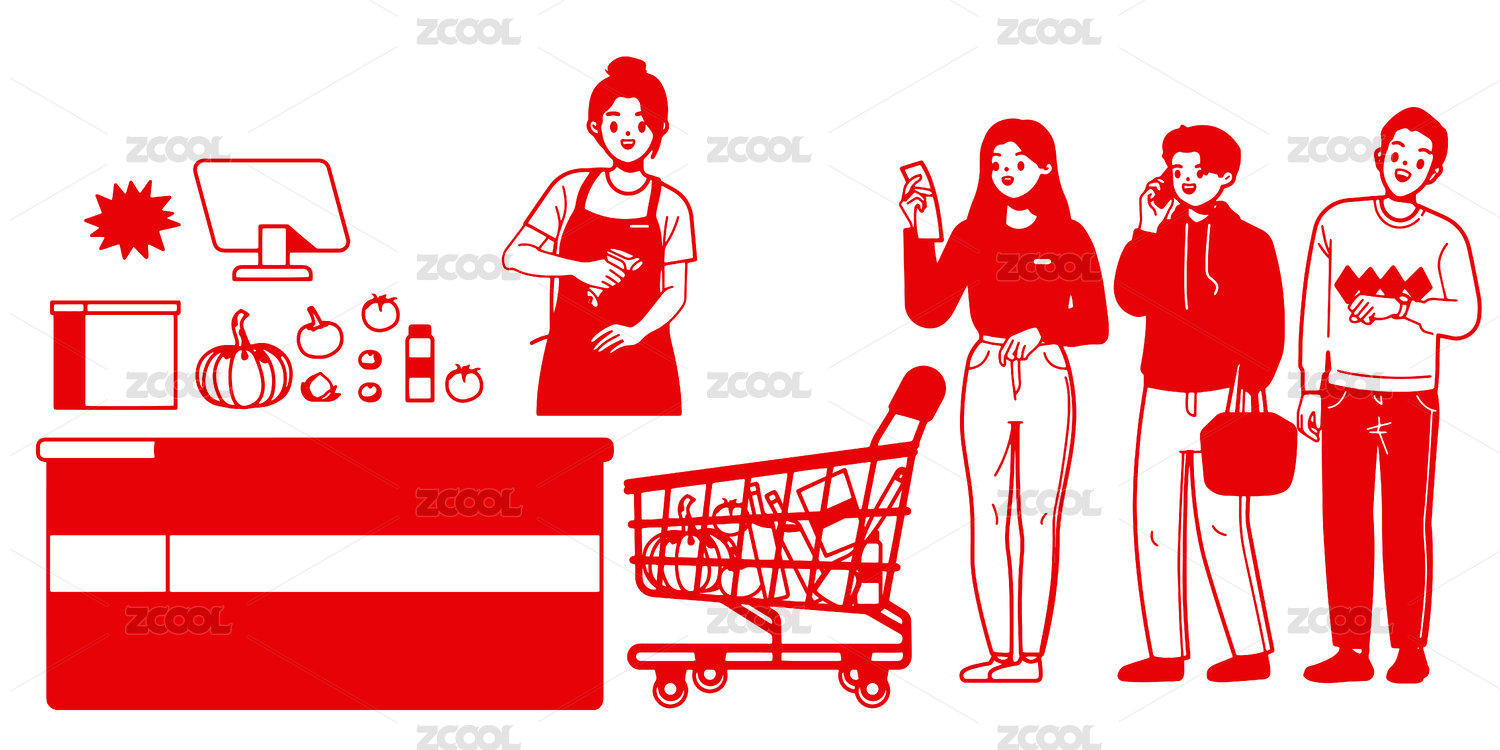剪纸风格在超市购买商品排队结账的人群