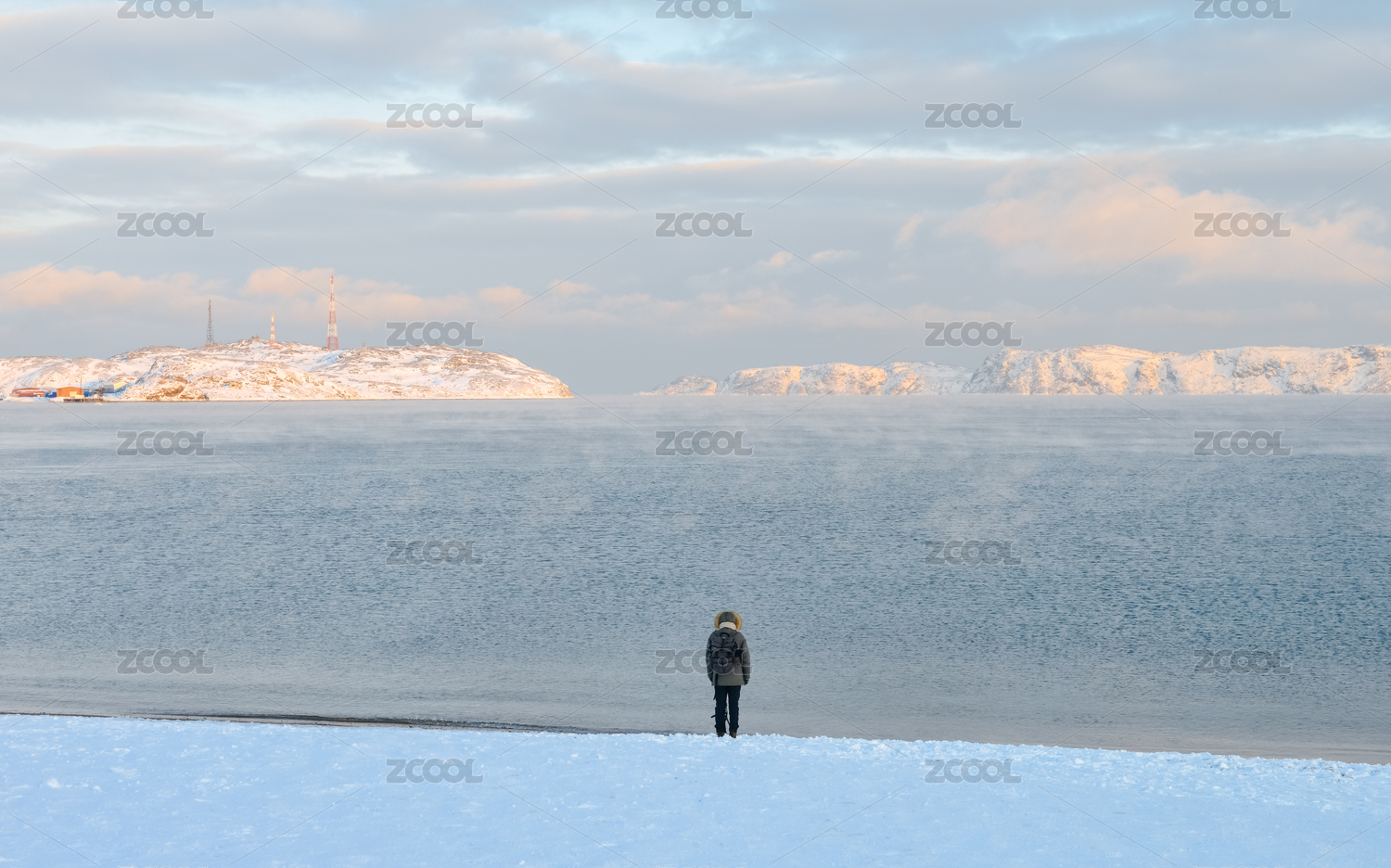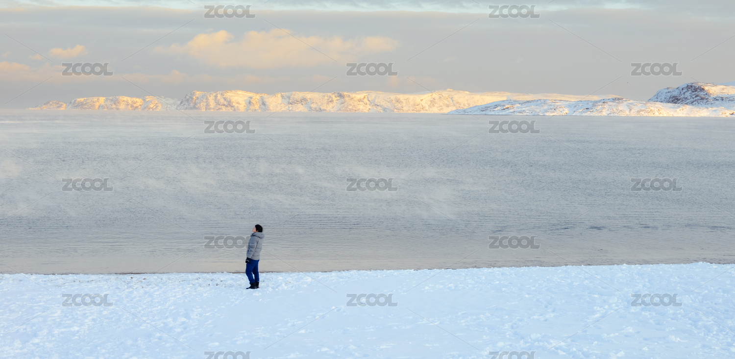 年轻亚裔女性站在俄罗斯捷里别尔卡北冰洋边上