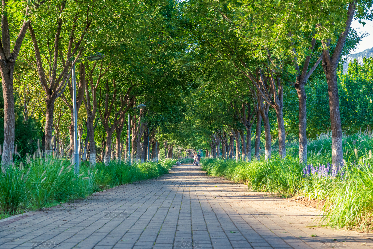 北京奥林匹克森林公园林荫道上的阳光漫步