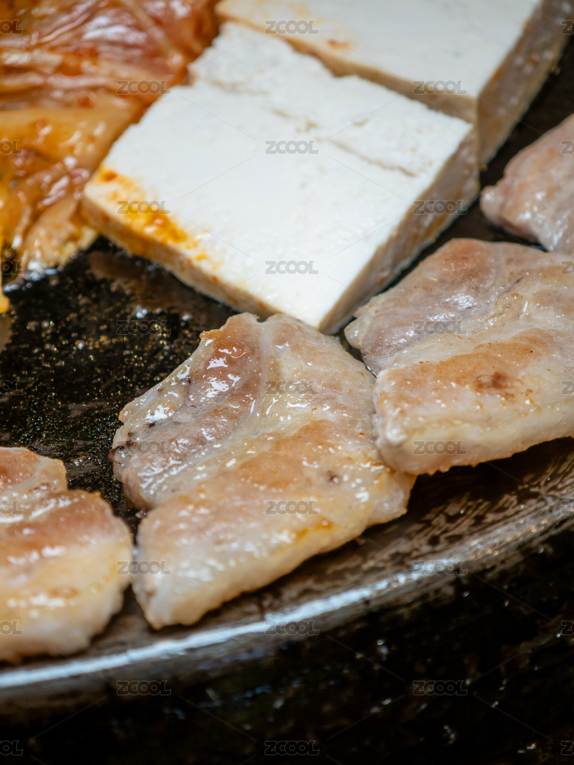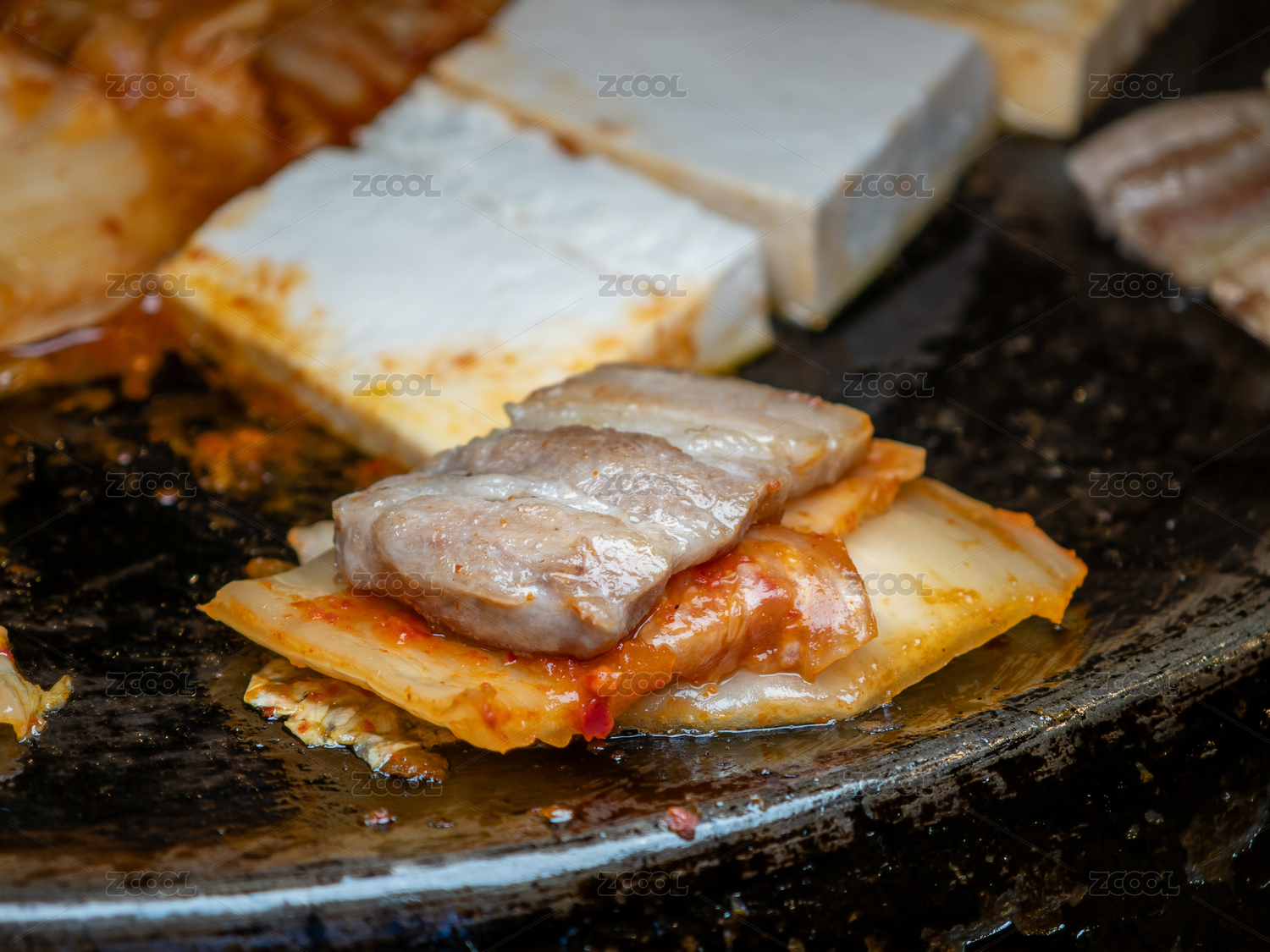 韩国餐厅里传统的釜盖烤五花肉配泡菜和豆腐